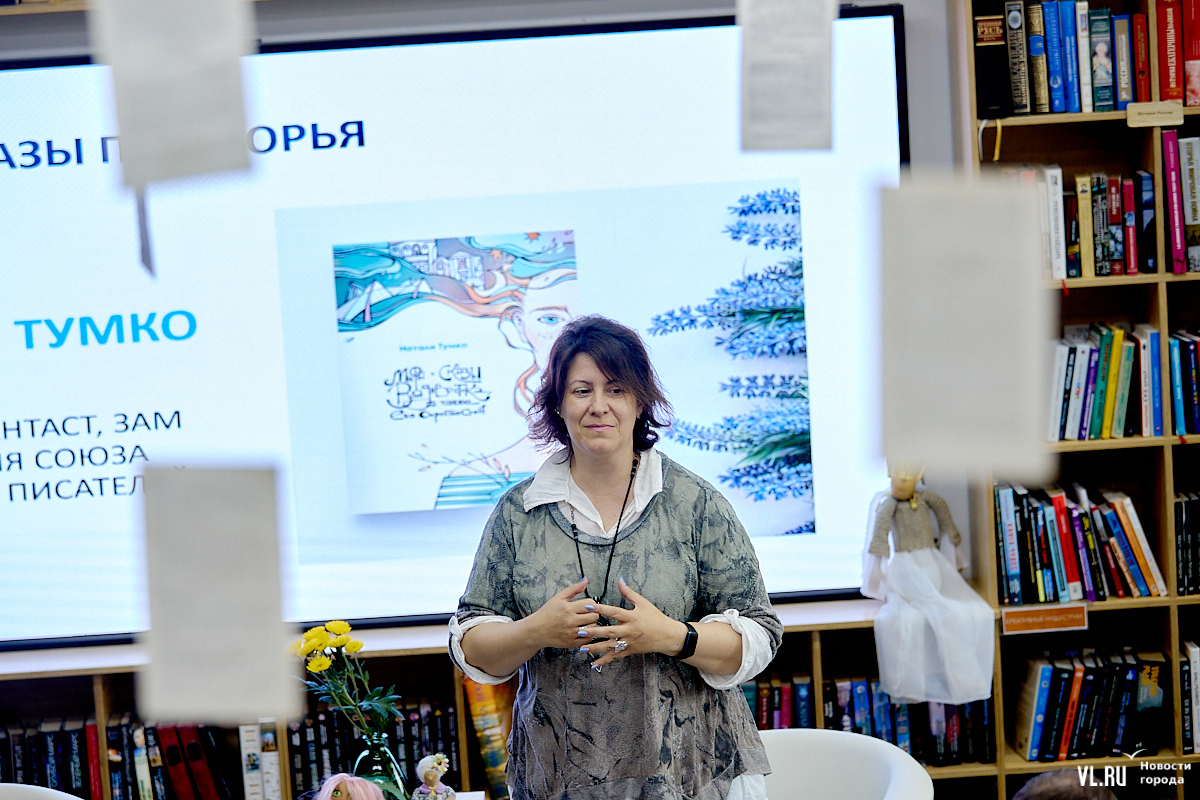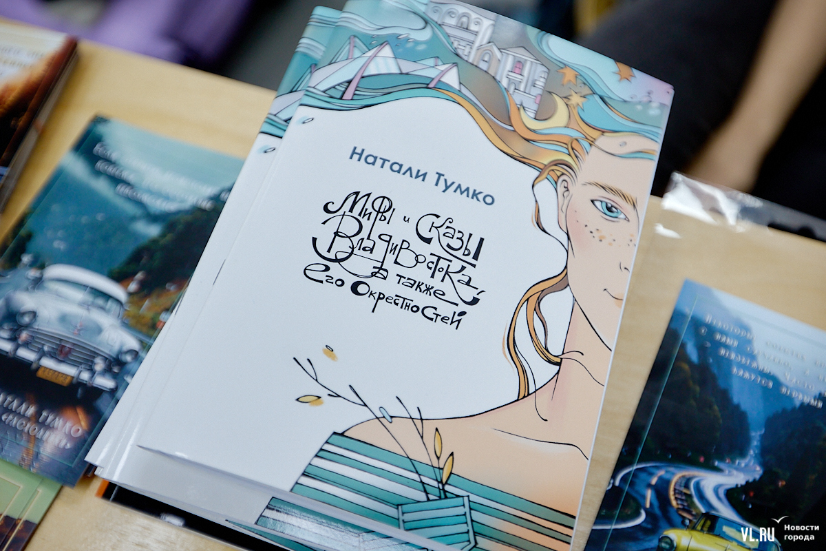 В субботу, 1 июня, в библиотеке «БУК» прошла презентация книги «Мифы и сказы Владивостока, а также его окрестностей» приморского писателя-фантаста, футуролога Натали Тумко. В сборник вошло 30 коротких мифов о местных явлениях и реалиях. Всего же автор создала уже более сотни мифов. Книга содержит цветные иллюстрации, рисунки для раскрашивания и куар-коды, перейдя по которым, можно послушать аудиозаписи мифов.