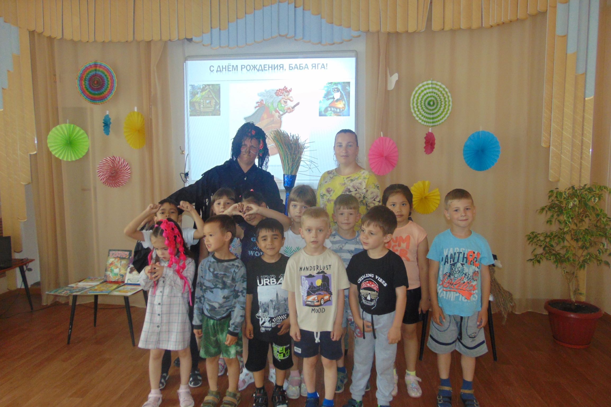 Дошкольникам была показана яркая музыкальная презентация, из которой они узнали о многоликости вредной и, несмотря на это, доброй старушки, живущей в «избушке на курьих ножках», а также увидели её друзей, пришедших на торжество – кот-баюн, домовёнок Кузя, Змей Горыныч и Кощей бессмертный. Из всех друзей бабы Яги особенно ребятам понравился домовёнок Кузя. Библиотекарь рассказала детям историю о том, как однажды Кузенька спас Ягу от зубной боли; был зачитан отрывок из книги Александровой Татьяны Ивановны «Домовёнок Кузя и Баба Яга».
