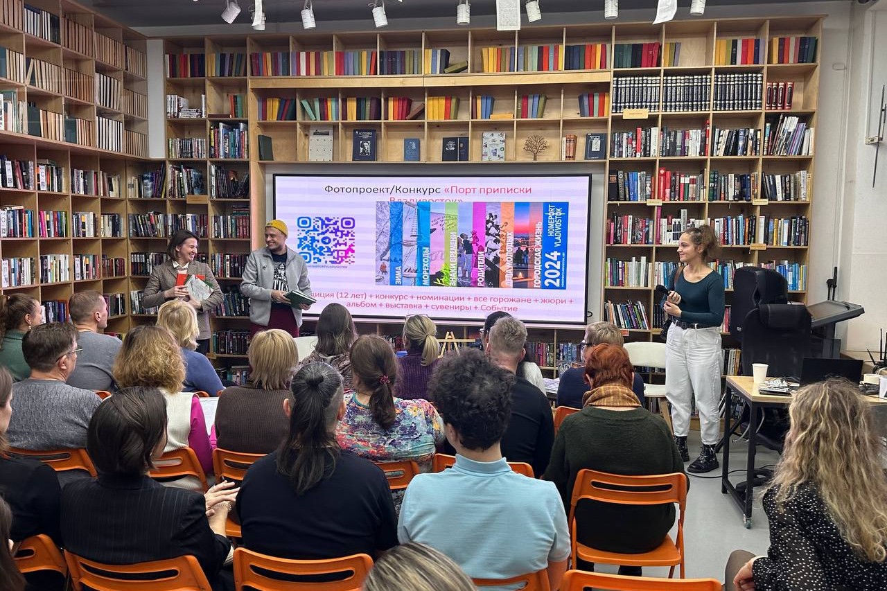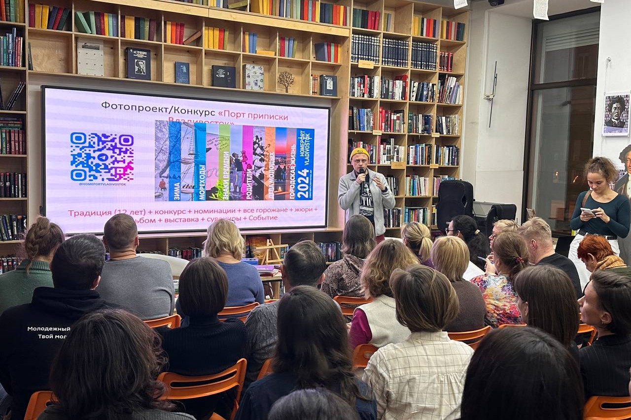В начале встречи Антон Новгородов и Анастасия Теличко, кураторы фотопроекта, рассказали аудитории о ежегодном фотоконкурсе «Порт приписки Владивосток», в котором может принять участие любой желающий. «Для этого не требуется быть профессиональным фотографом, достаточно лишь чуткости, наблюдательности и любви к своему городу. Владивосток с его уникальным ландшафтом, историей и бурными изменениями, предоставляет бесконечные возможности для творчества.»