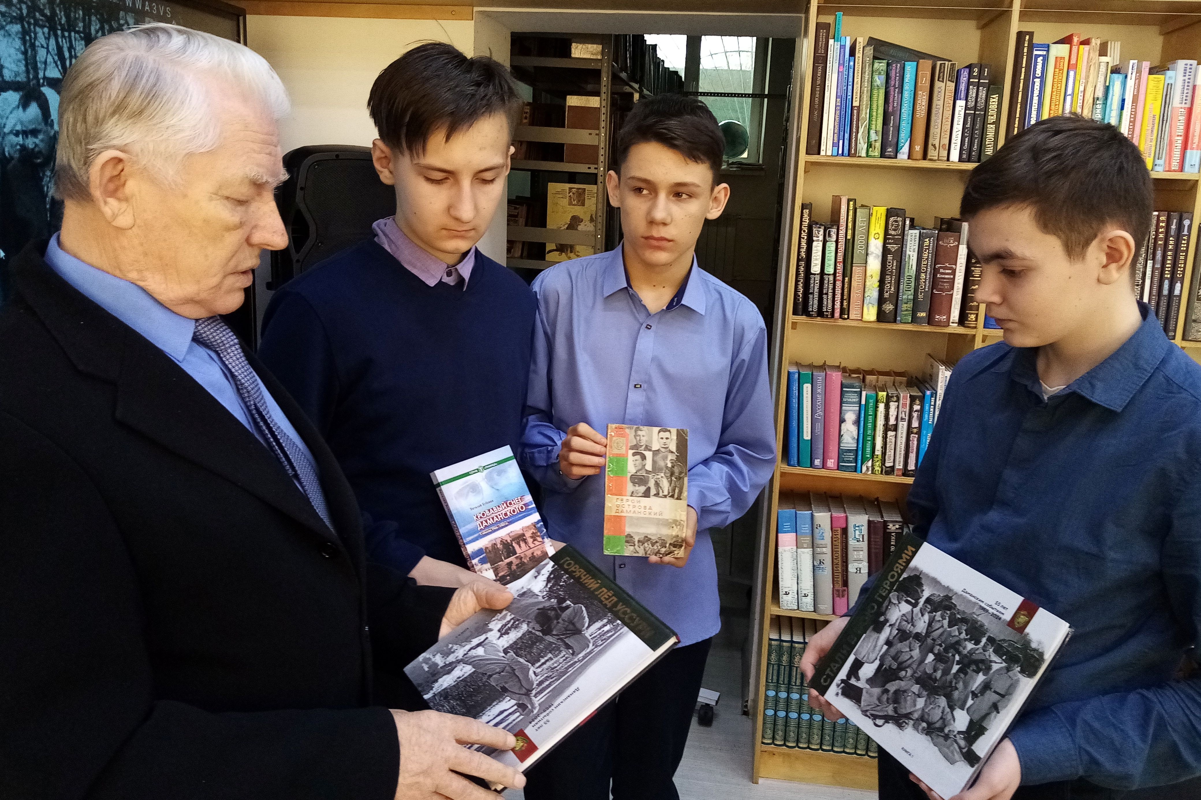 На книжной выставке, которая заинтересовала ребят, среди представленных книг, рассказывающих об этом военном конфликте с разных сторон, школьники обратили внимание на исторический альбом «Даманский излом», подготовленный во владивостокском издательстве «Русский остров», в порядке хронологии раскрывает ход событий с описанием и схемами боев, фотографиями того времени. В книге представлены около 300 фотодокументов, поименные списки солдат и офицеров, награждённых орденами и медалями, а также сведения о павших героях и их фотопортреты. Очень интересна книга воспоминаний Героя Советского Союза, генерал-майора запаса В. Д. Бубенина «Кровавый снег Даманского: события 1966-1969 гг.». В 1969 году автор, будучи молодым офицером, командовал пограничной заставой и принимал непосредственное участие в конфликтных ситуациях на границе.