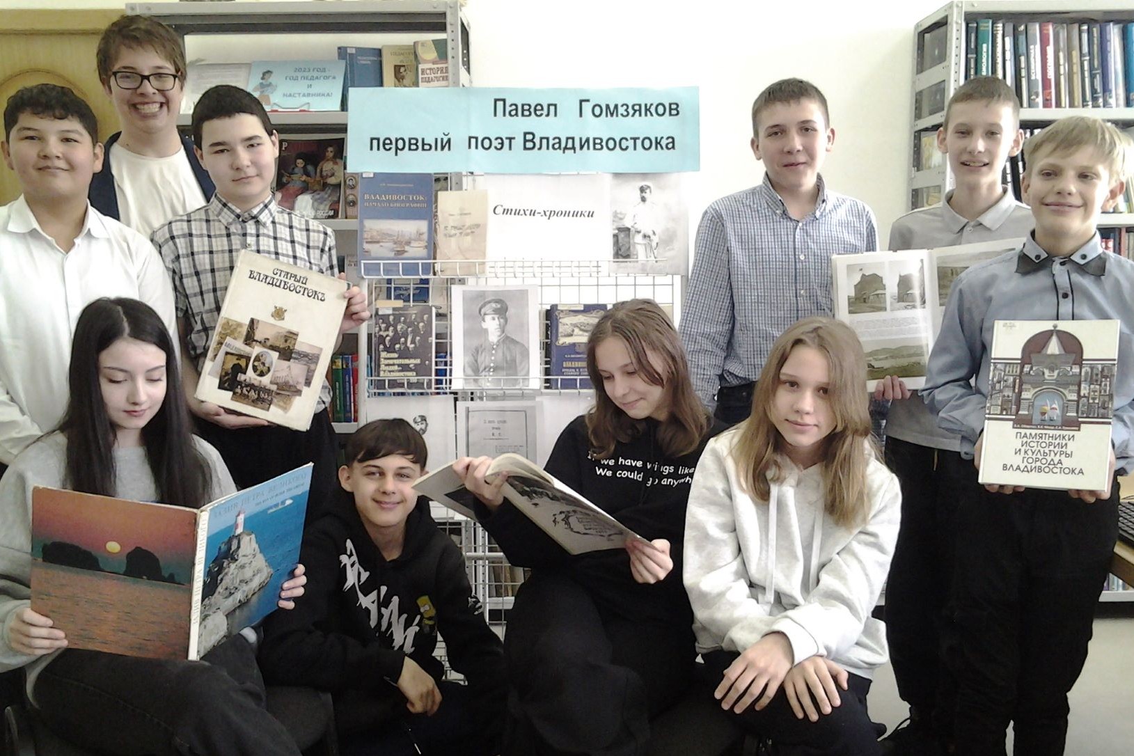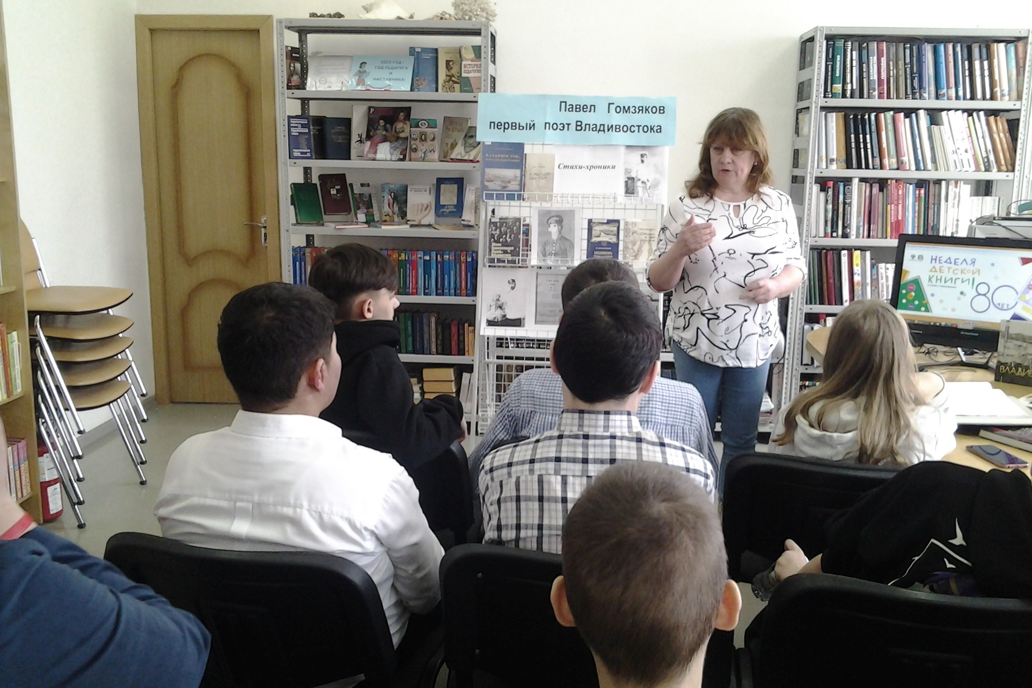 В юбилейный для Недели детской и юношеской книги год библиотека № 16 познакомила ребят с творчеством приморского поэта Павла Васильевича Гомзякова. Старшеклассники школы № 43 познакомились с творчеством приморского поэта, с его жизнью, с тем, чем для поэта стал город, как повлиял на его творчество.