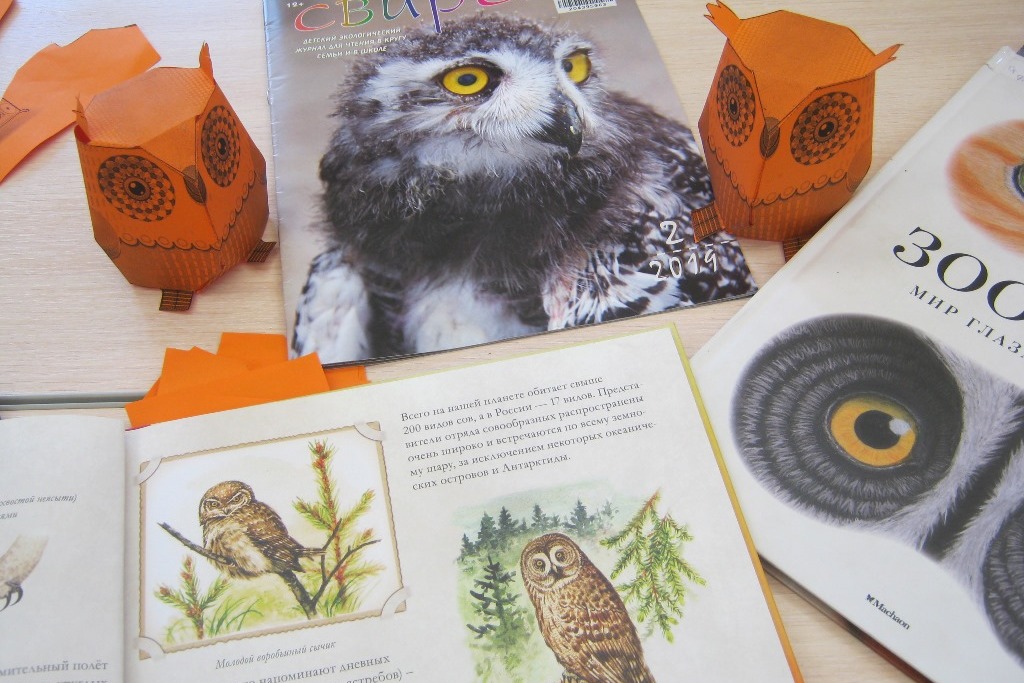 Дети с интересом просмотрели книги о совах: Владимир Бабенко «Небольшая книга о совах», Бренда Гибнрсон «Жизнь в тайге», Гийом Дюпра «Зооптика». Мир глазами животных», журнал «Свирель» №2 за 2019 год (где Владимир Бабенко рассказал все о белой сове).