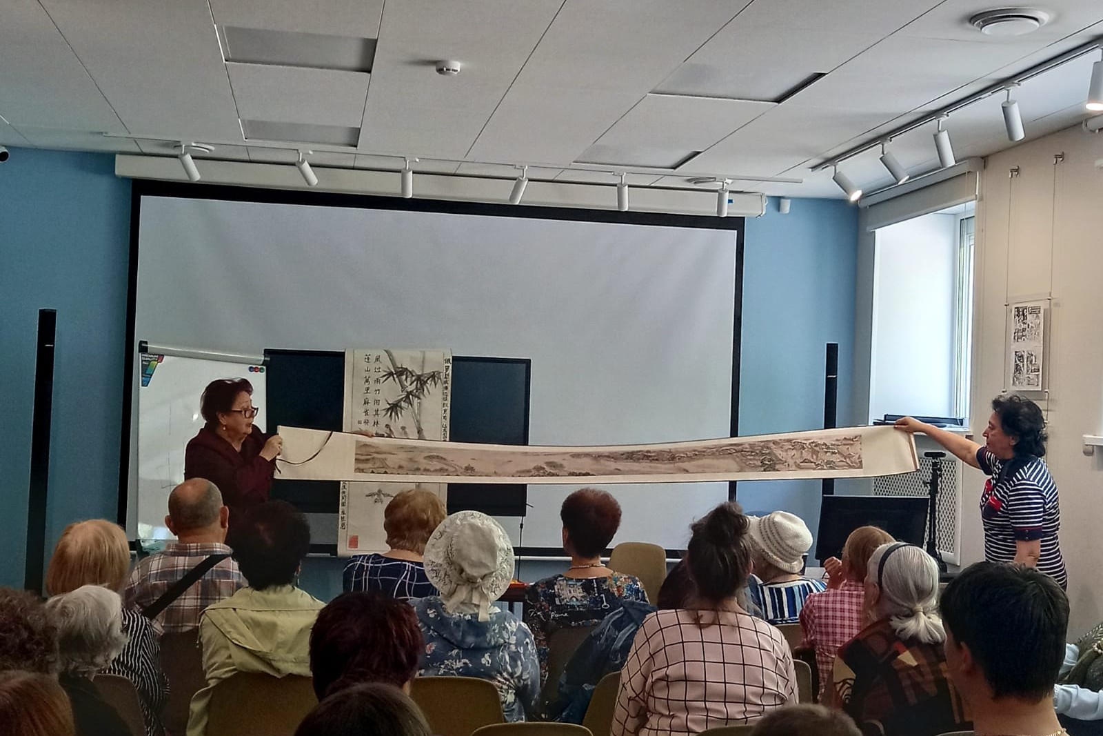 Был представлен образец живописи Китая — бумажный свиток с нарисованным черной тушью рисунком. Китайцы считали, что свиток бесконечен и не заключали свои картины в рамы. Такой свиток соединял в себе четыре вида искусства: живопись, каллиграфию, литературу и печать. Наталья Александровна перевела написанный иероглифами стих на свитке-про растрепанного воробья, пролетевшего 10 тысяч ли под бурей и ветром. Участники встречи смогли также полюбоваться и даже прикоснуться к другому свитку-картине, выполненной на шелке.