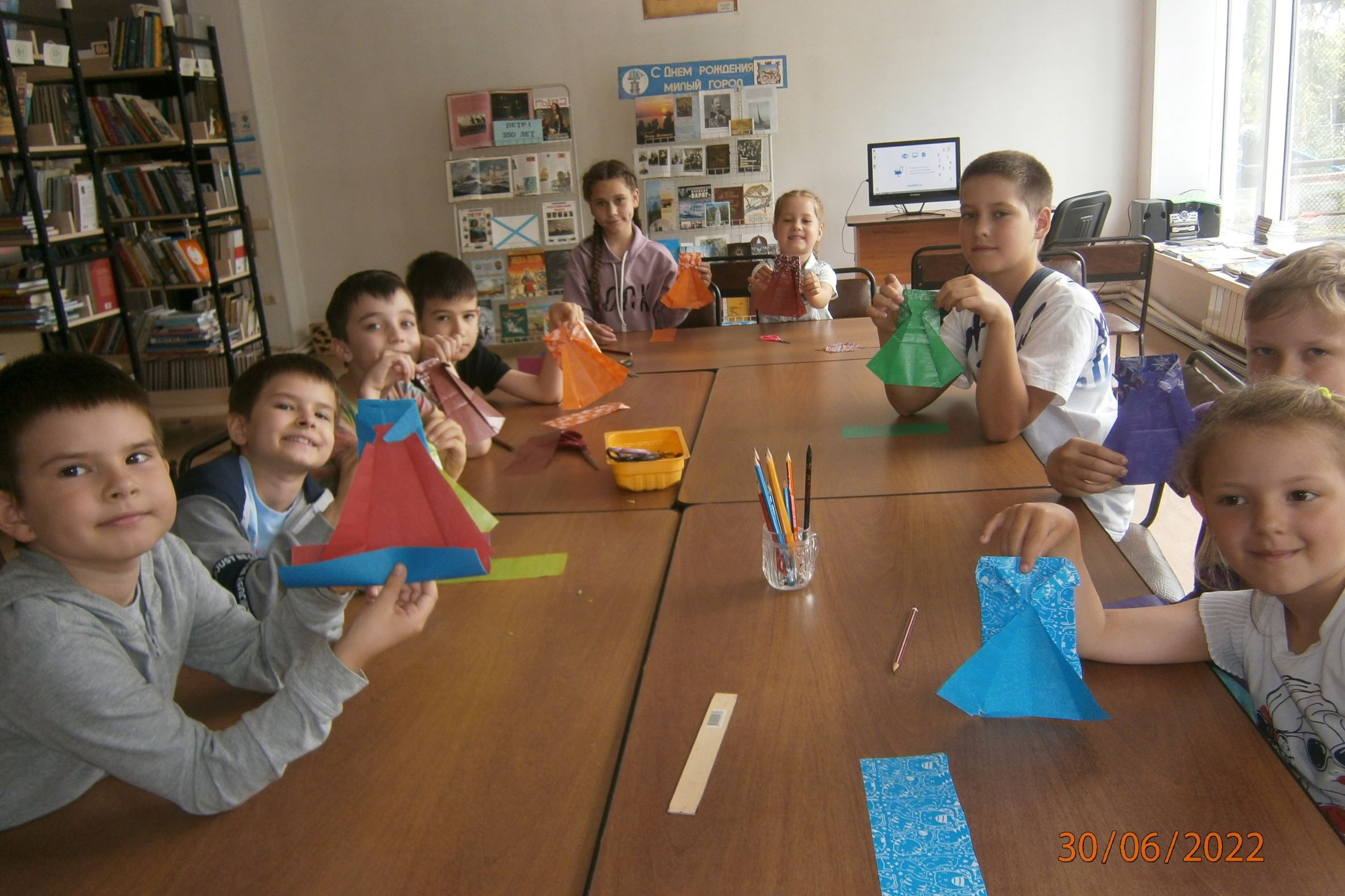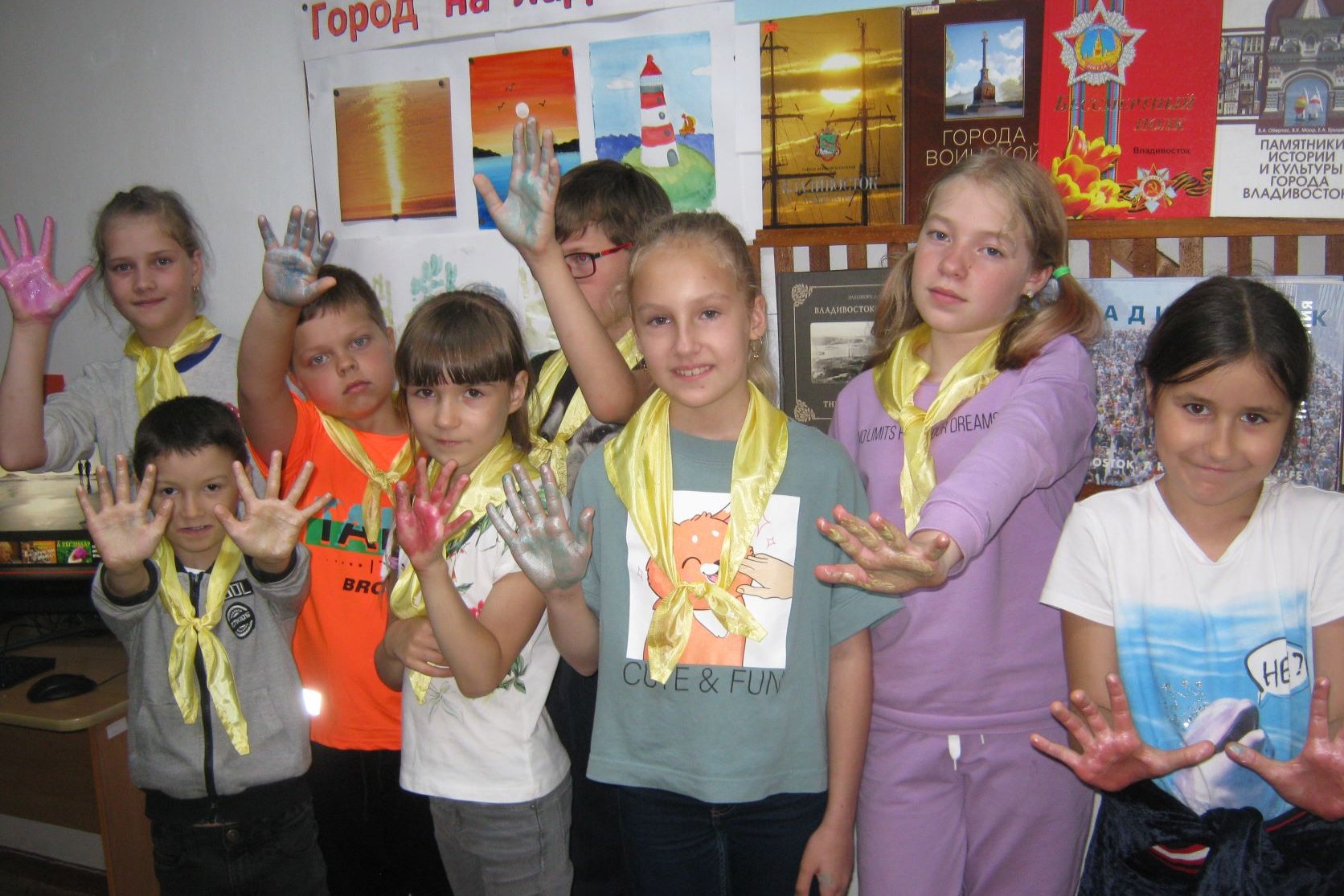 Библиотека №15 организовала для детей из пришкольного лагеря школы № 54 и Детского центра «Дай пять!» поэтическую композицию по стихам поэтов Бориса Лапузина, Ивана Шепеты, Елены Обойминой. Дети посмотрели видеоклип под песни о Владивостоке. Восхищались необыкновенной красотой ночного города, узнавали памятные места, зачарованно смотрели на город с космической высоты. Они и сами решили оставить на память о сегодняшнем дне свои детские ладошки в виде рисунка города.