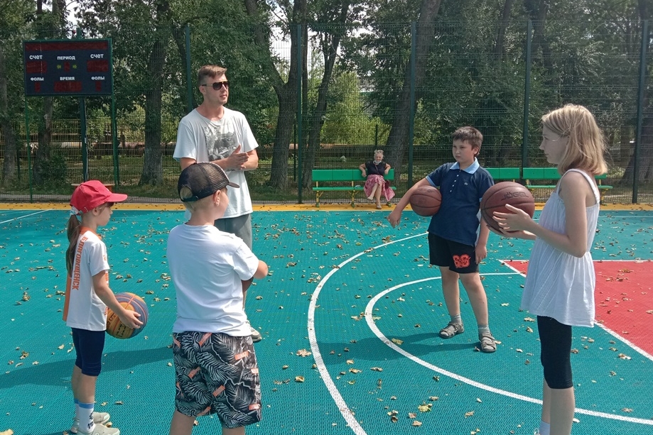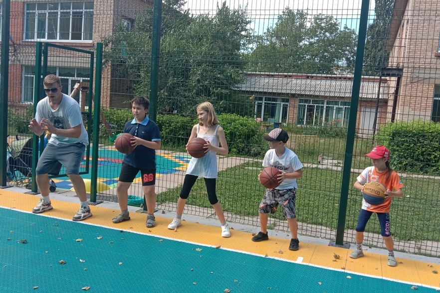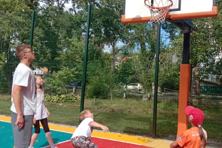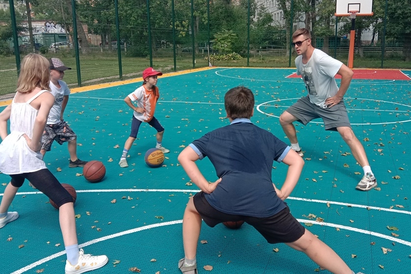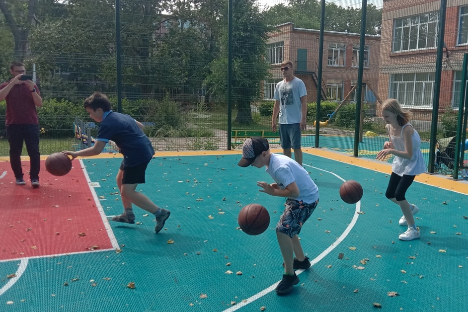 После теоретической части ребята осваивали азы игры в баскетбол на новой баскетбольной площадке, открытой в прошлом году по адресу ул. Кутузова, д. 10 при «Школе Дружбы». Эта площадка особая гордость Дмитрия Александровича Гордеева: специальное покрытие, скамейки, электронное табло, кольца опускаются под рост детей. Теперь у ребят есть возможность заниматься баскетболом в хороших условиях.