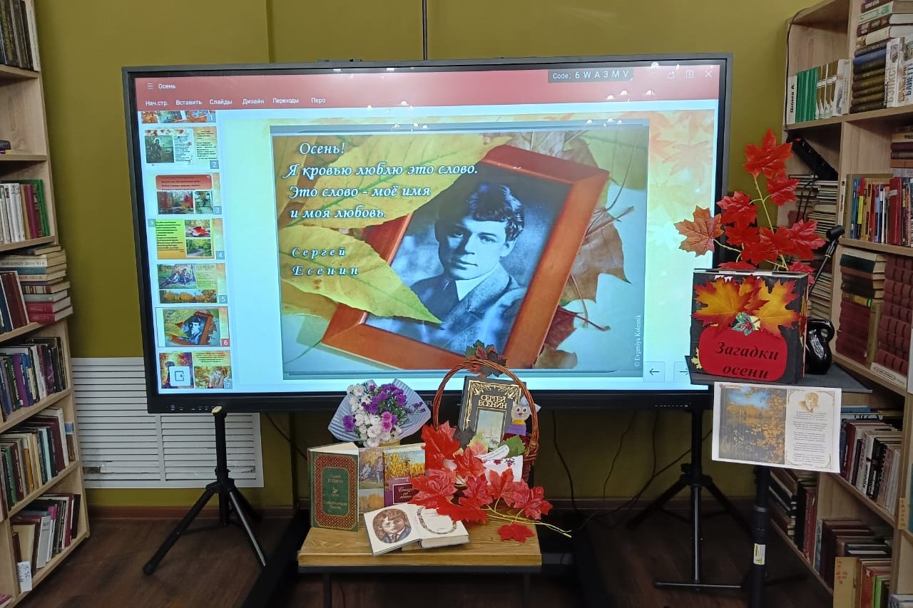 В библиотеках организованы книжные выставки: в библиотеке № 17: книжная выставка «Незабываемая лира Сергея Есенина», в библиотеке № 12 организована книжная выставка- портрет «Поэтический мир Сергея Есенина», в библиотеке № 2 пос. Трудовое: книжная выставка «Есенинская грусть». У выставки прошли громкие чтения стихов писателя «Листопадовый лес».