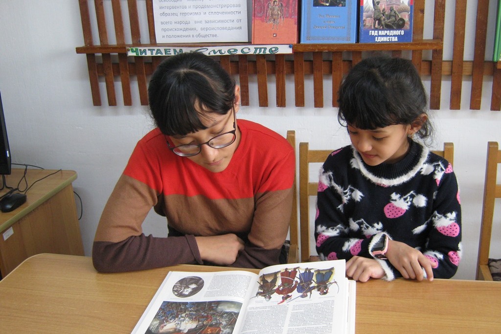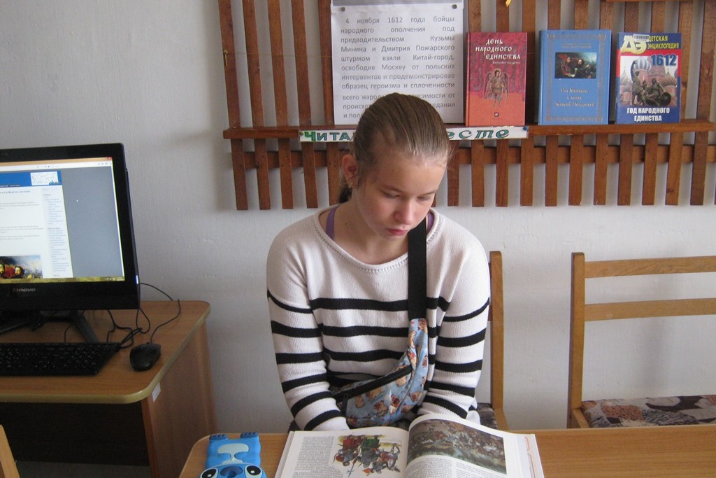 По-настоящему познавательными получились каникулы осени для ребят, посетивших библиотеку №15. 1 ноября практически с утра и до вечера в библиотеке проходила встреча читателей с книгами. 1612 год стал сюжетом многих книг. Читатели — дети, подростки, взрослые с удовольствием листали страницы книг, смотрели презентацию «Год народного единства», с удовольствием обсуждали увиденное, прочитанное. Хотелось бы отметить двух сестричек Пазыловых — семиклассница Мубина и ее младшая сестра, первоклассница Захро. Девочки с удовольствие читали (Мубина), рассматривали рисунки, что не захотели расставаться с книгой Сергея Истомина «Минин и Пожарский», взяли домой, чтобы почитать всем вместе, с братом Хамидом и сестренкой Мунисахон.