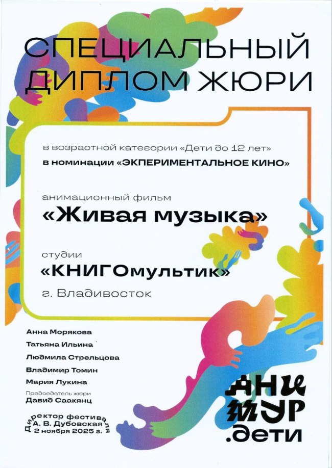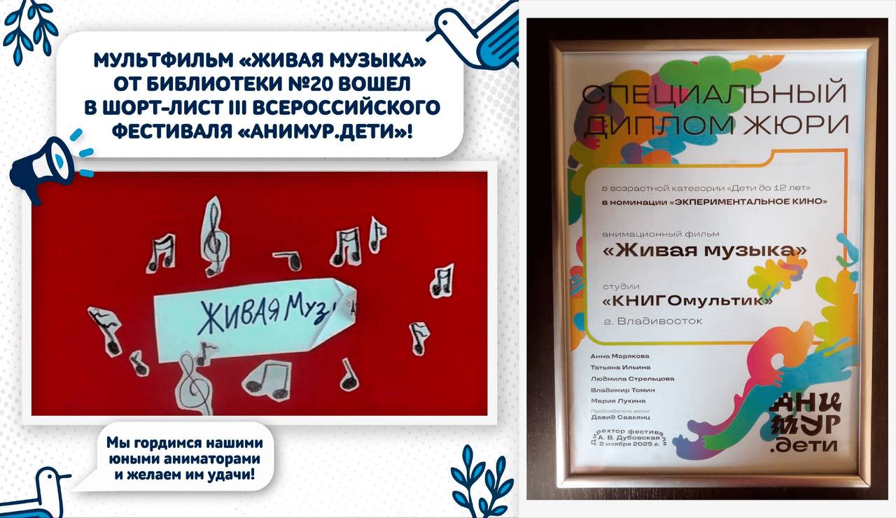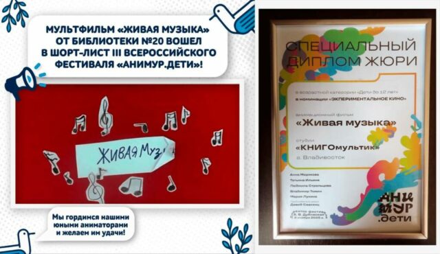 Фестиваль стал знаковым событием для Владивостокской централизованной библиотечной системы, ведь анимационная студия Библиотеки № 20 получила диплом третьего всероссийского фестиваля детской мультипликации «Анимур.Дети» в возрастной категории «до 12 лет». В номинации «Экспериментальное кино» дипломантом признан фильм «Живая музыка» студии «КНИГОмультик», а награду на сцене получила руководитель Юлия Савина. Работа была отмечена специальным призом жюри конкурса.