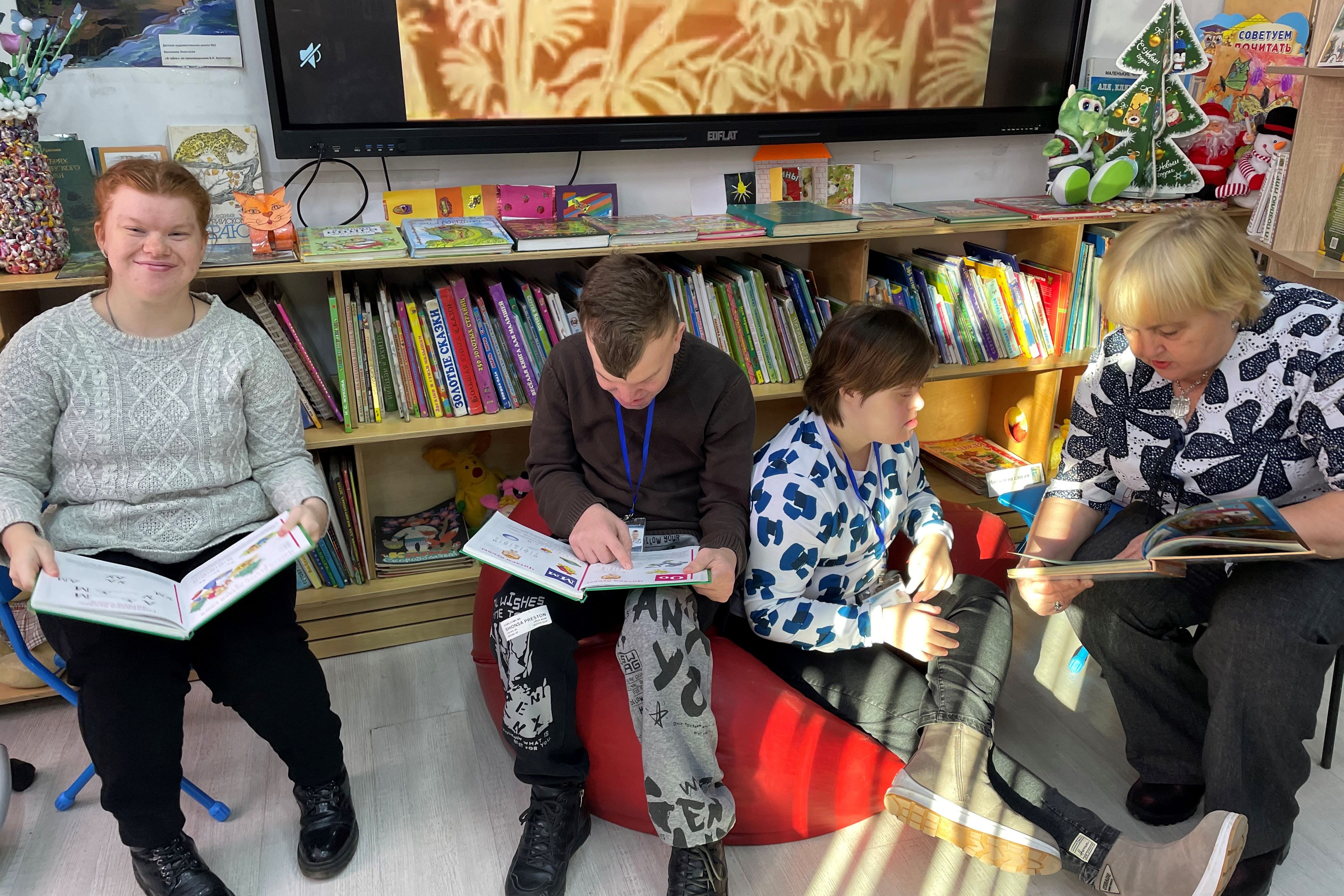 Ребята с интересом смотрели разные книги и журналы, удобно устроившись на пуфах, с удовольствием слушали сказки, читали вслух.