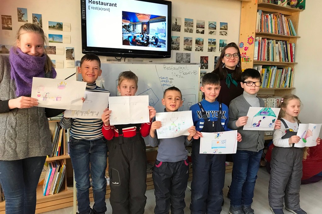 Дети получили суперзадание – разработать меню и дизайн своего ресторана, придумать ему оригинальное название. Затем надо было на своих листочках нарисовать изученные слова.