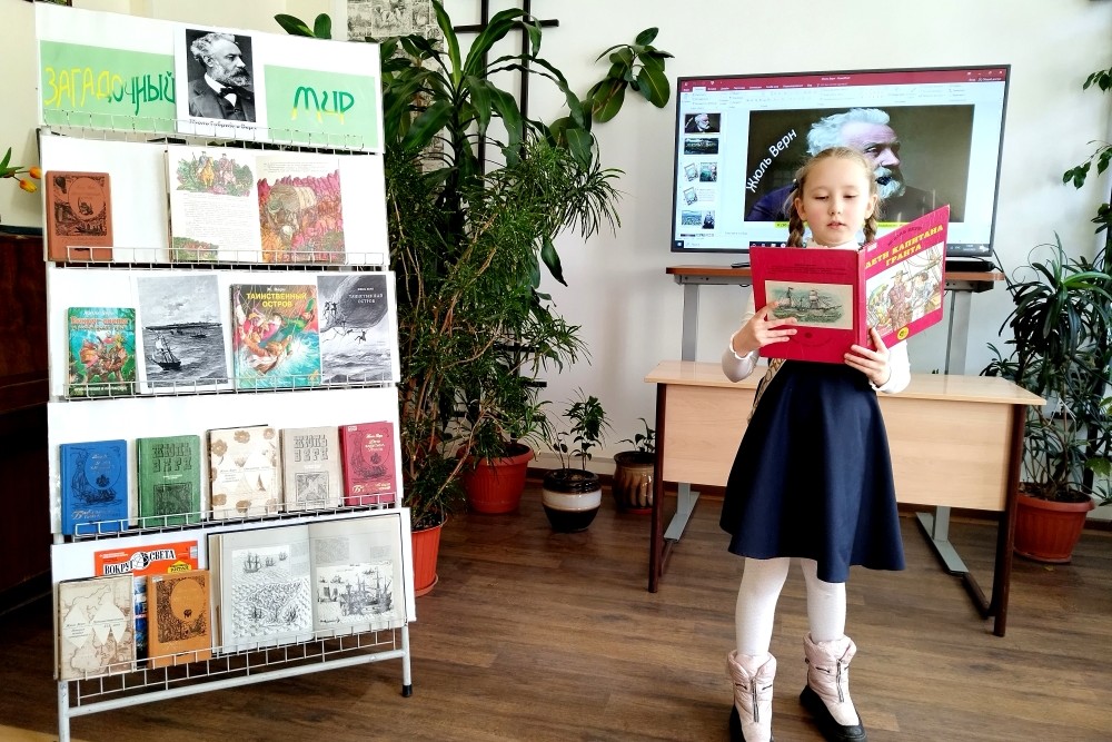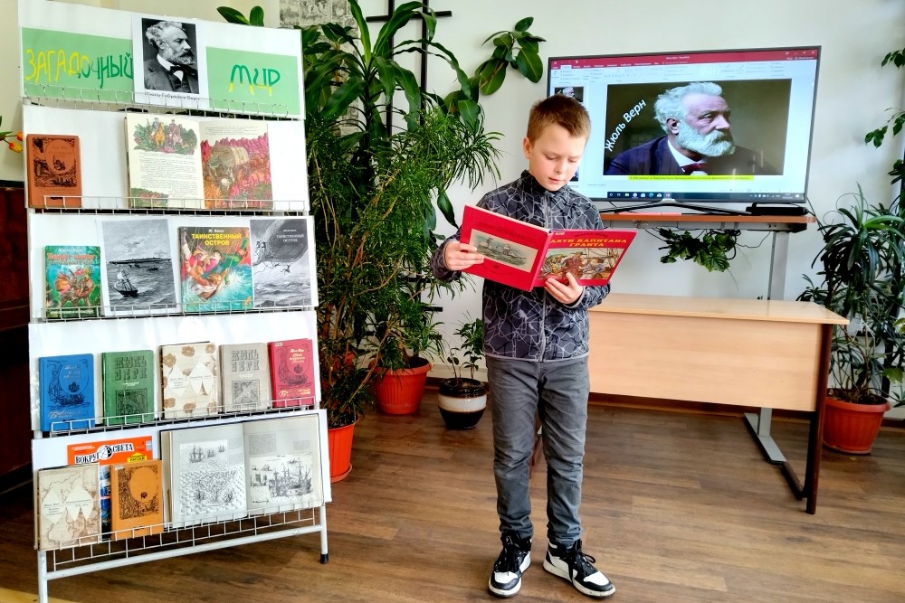 Ребята совершили увлекательное виртуальное морское путешествие и узнали о приключениях некоторых героев из романов «Дети капитана Гранта», «Таинственный остров» и «20 000 лье под водой», по которым сняты интересные приключенческие фильмы. Юные читатели отметили, что в этих произведениях можно найти не только восторженное описание техники, путешествий, но и яркие и живые образы благородных героев и симпатичных чудаковатых учёных. Школьники узнали о том, что в своих произведениях Ж. Верн предсказал научные открытия и изобретения в самых разных областях, в том числе акваланги, самолет, вертолет и космические полёты. Технику чтения ребята показали на громком чтении отрывков из «Капитан Немо». Иллюстрациями к рассказу послужили фрагменты из художественных фильмов по книгам писателя.