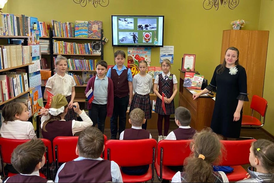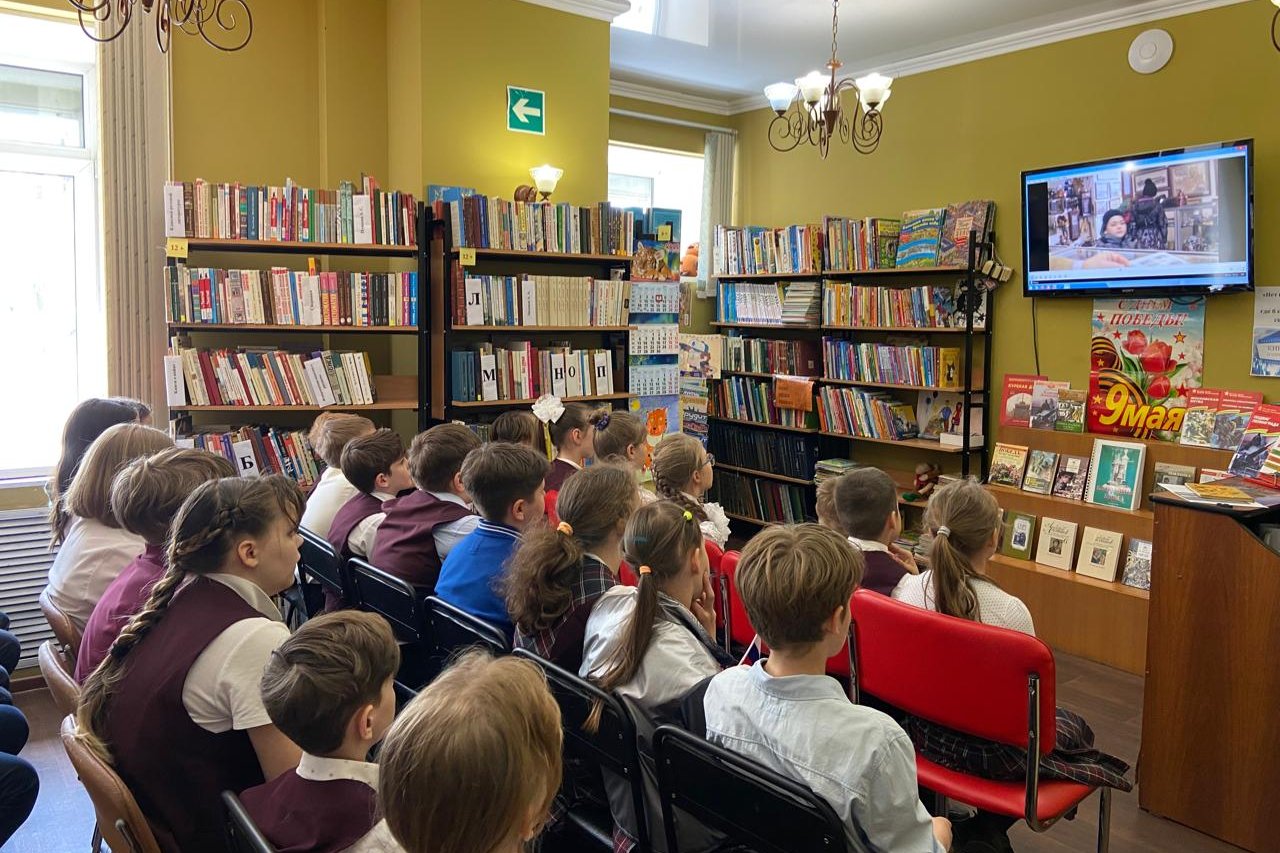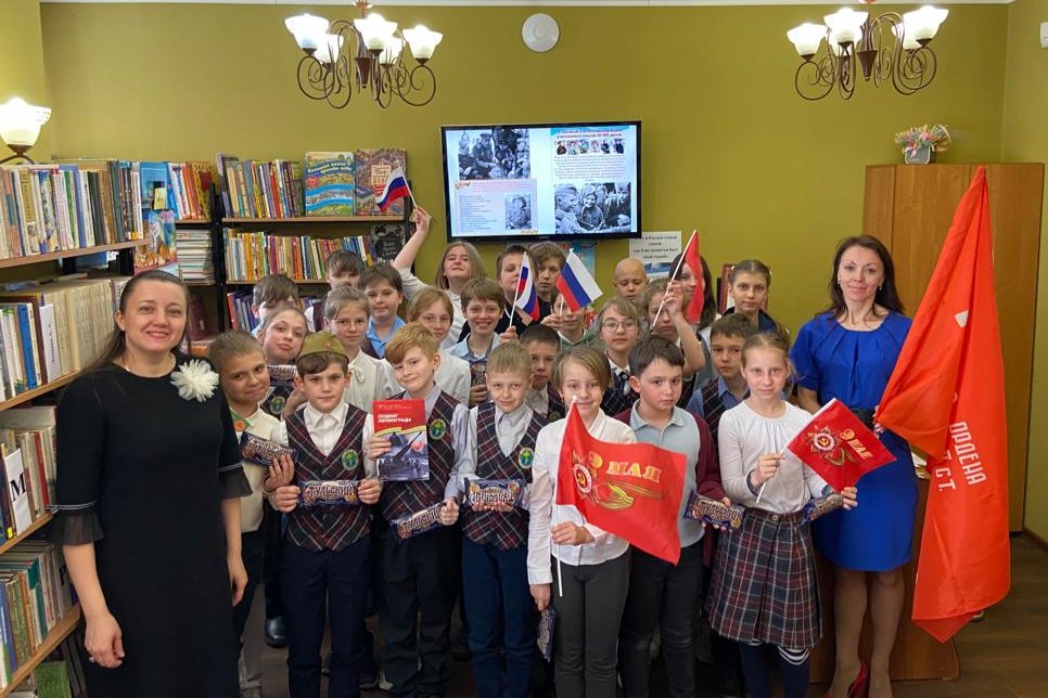 После праздничного митинга школьники отправились в библиотеку, чтобы принять участие во Всероссийской акции «Киноуроки в школах России» и познакомиться с фильмом «Наследники Победы».