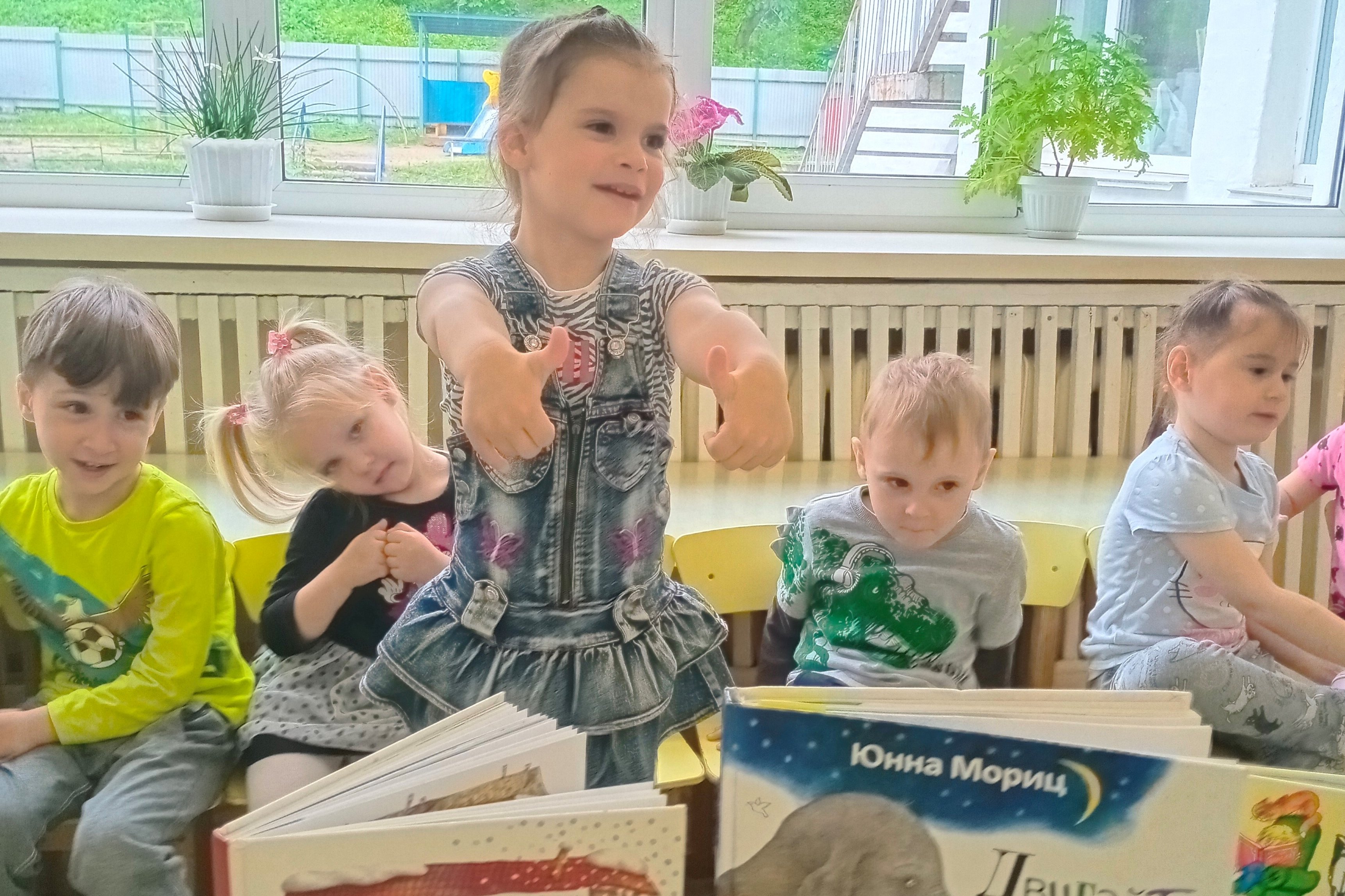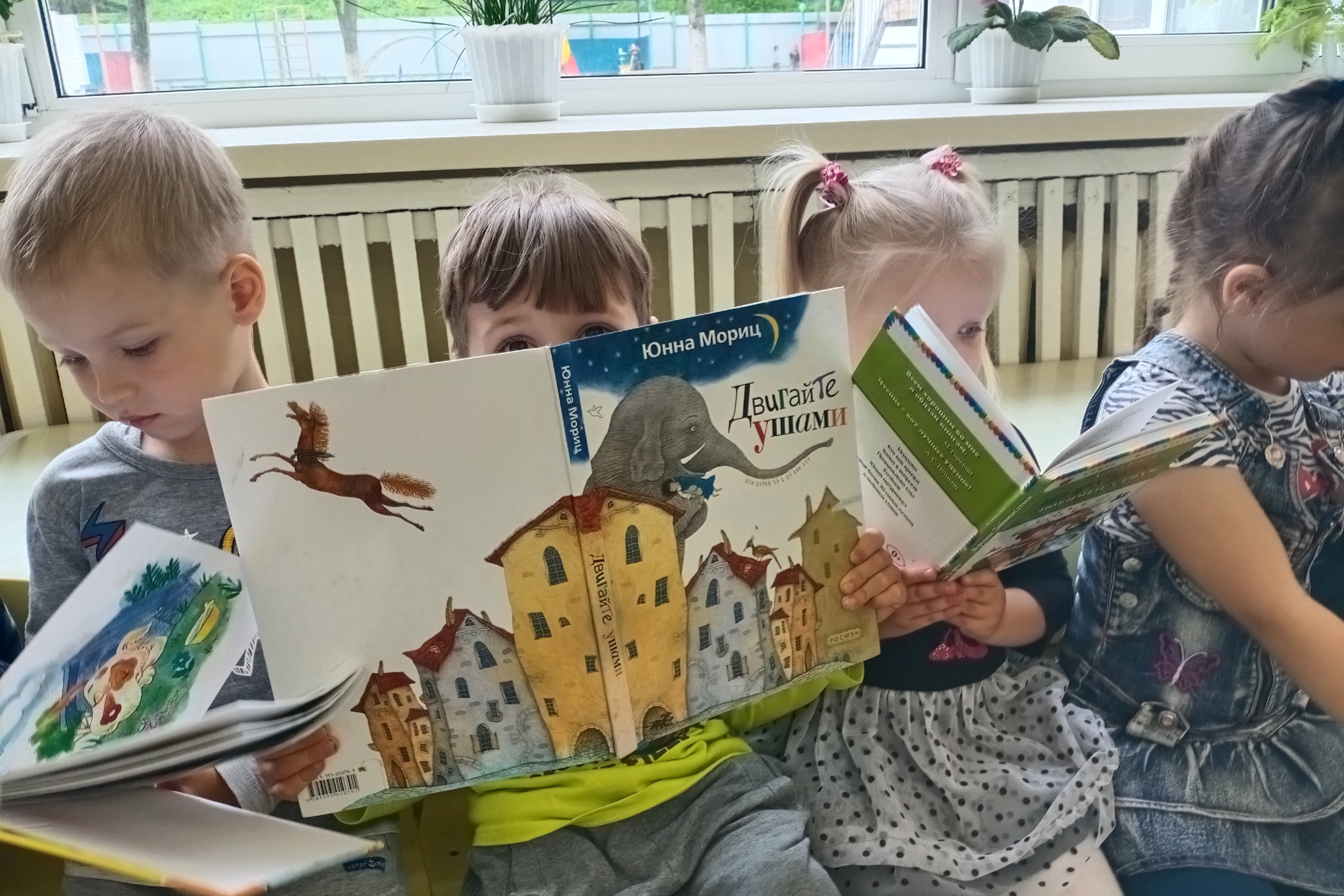 С разговора о творчестве поэтессы Юнны Петровны Мориц началось знакомство воспитанников ДОУ №5 с библиотекой №16. Ребята узнали о детстве поэтессы: Юнна Петровна Мориц родилась в 1937 году. Довоенное детство Ю. Мориц прошло в Киеве, где семью застала Великая Отечественная война. Четырехлетняя девочка начала сочинять стихи «от страха» в мире, где падали бомбы, гибли люди. На долю Ю. Мориц выпало много тяжелых испытаний — война, голод, болезни. Казалось бы, человек, который столько пережил, испытал, уже не может радоваться, но это не так — Юнна Мориц пишет такие замечательные, добрые стихи, которые нравятся и взрослым, и детям.
