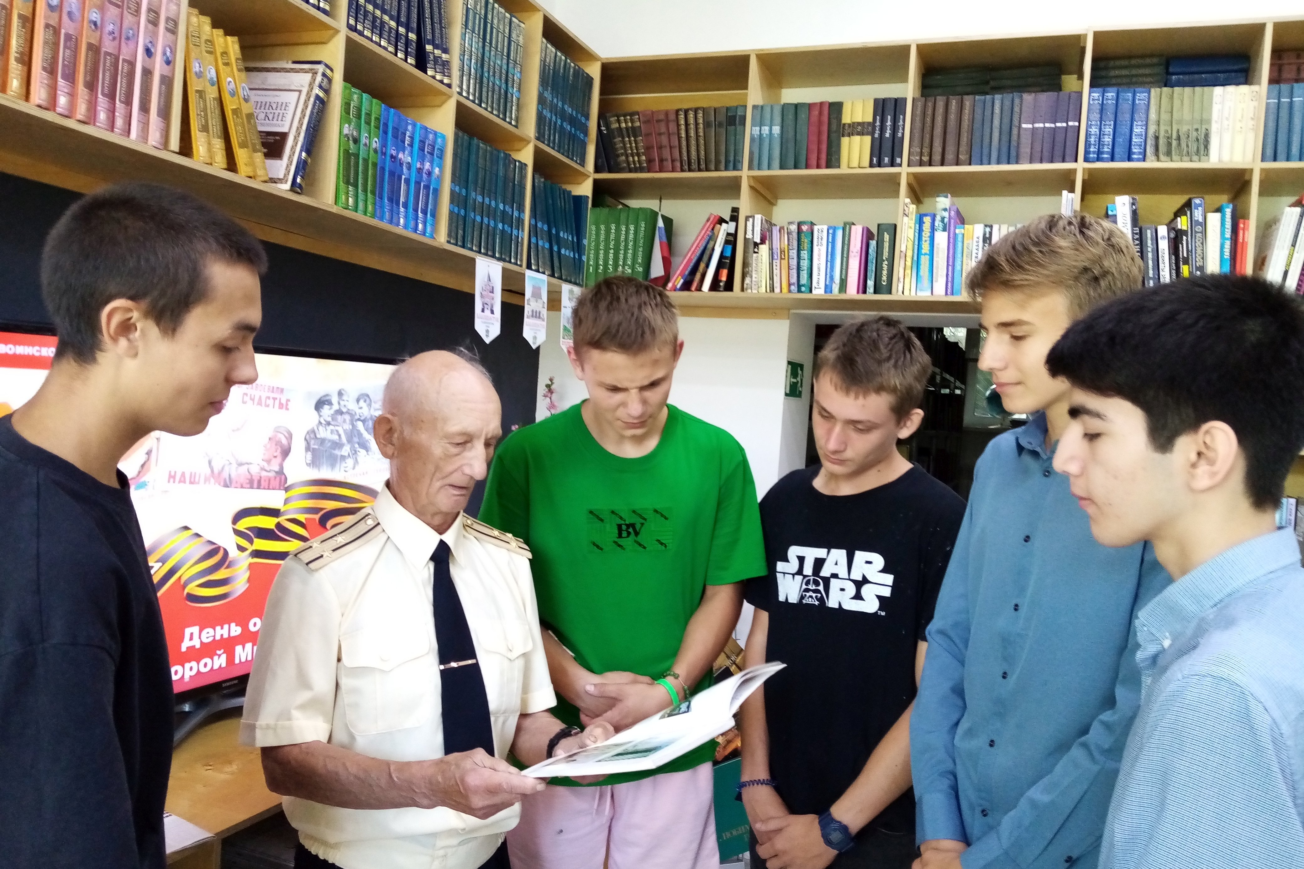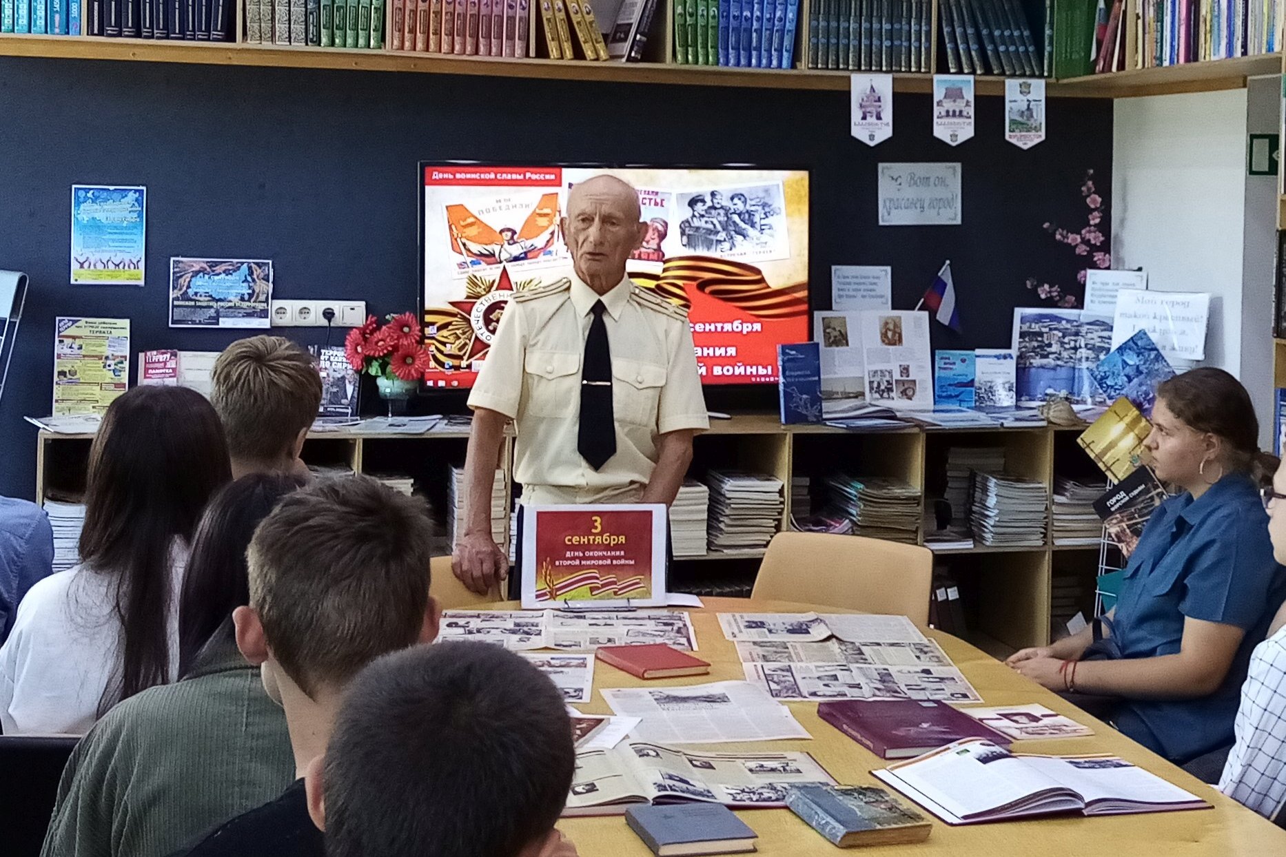 Урок мужества в библиотеке №12 провел ветеран вооруженных сил капитан первого ранга в отставке Романкевич Михаил Маркович. Он рассказал старшеклассникам школы №50 о том, что разрушительная, кровопролитная вторая мировая война, которая началась 1 сентября 1939 года нападением фашистской Германии на Польшу, закончилась в сентябре 1945-го года непродолжительной, но не менее жестокой и разрушительной войной с Японией.