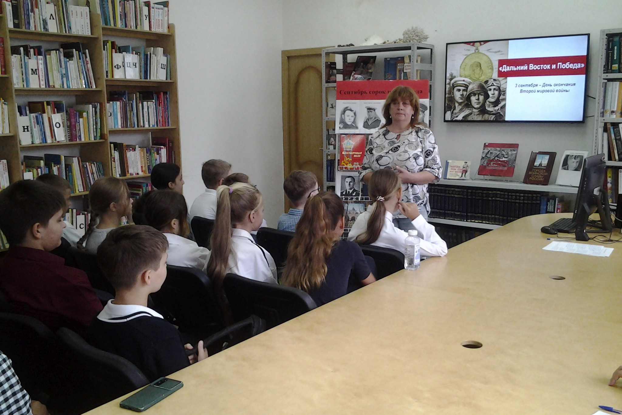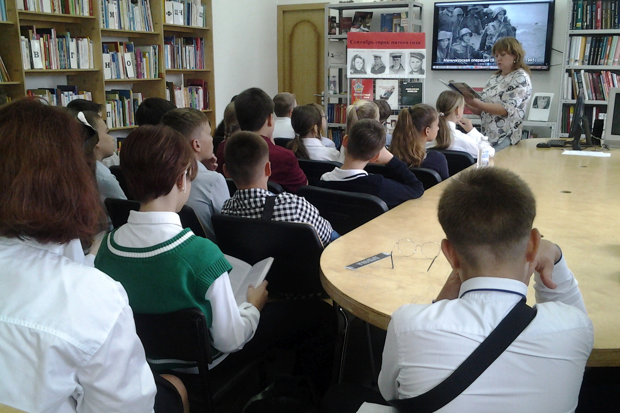 В рамках «Дней мира на Тихом океане» библиотека № 16 для школьников 5А, 5В и 6В и 7В классов МБОУ СОШ № 67 провела уроки мужества «Сентябрь сорок пятого года» в рамках межведомственного регионального проекта «Культура для школьников».