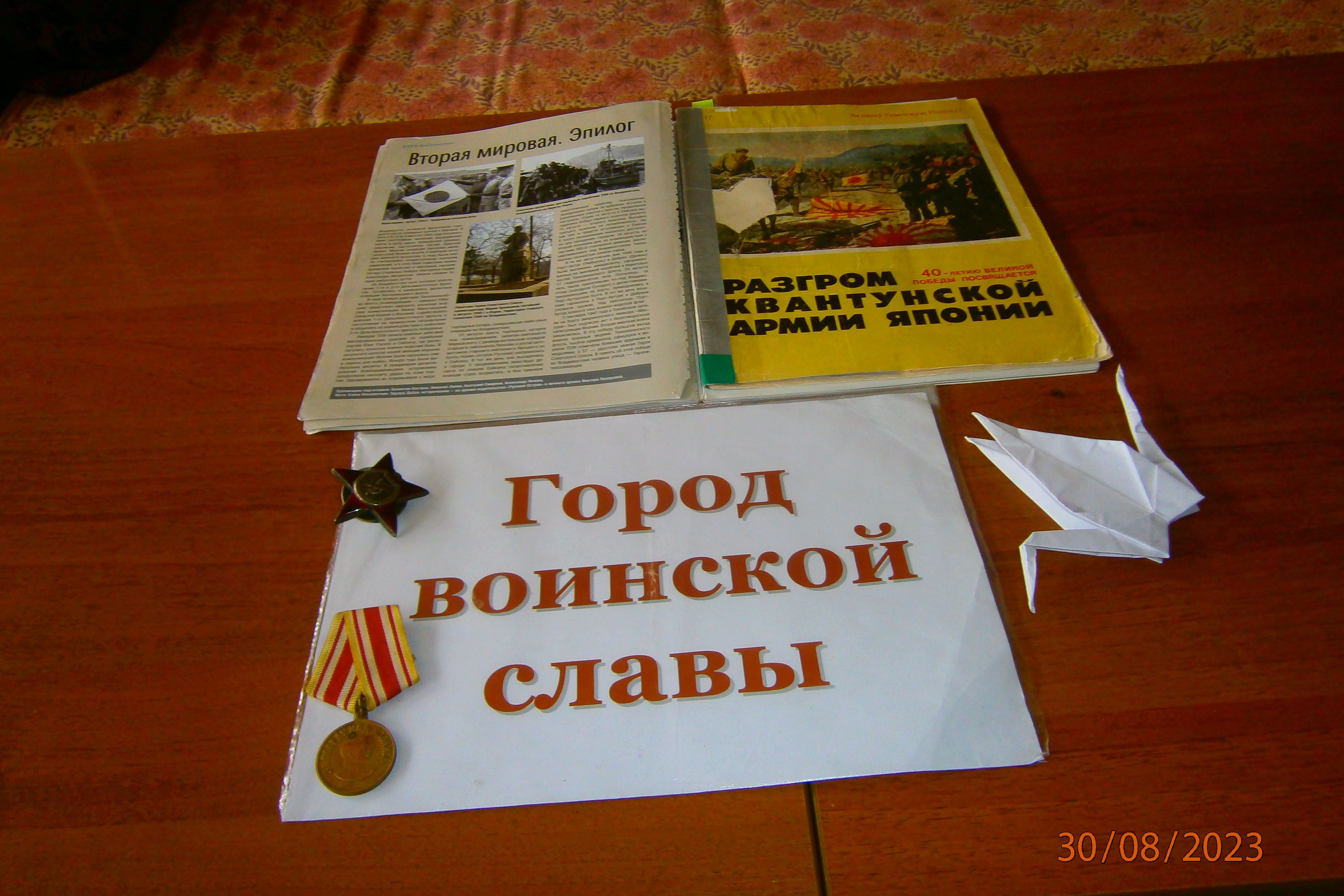 30 августа сотрудники библиотеки № 3 провели урок истории «Память пылающих лет» для подростков, находящихся ЦВСНП УМВД России по Приморскому краю. Школьникам рассказали о Маньчжурской операции 9 августа-2 сентября 1945года, после чего подростки посмотрели фотографии и картины об этом периоде. Узнали, как владивостокцы отмечали 2 сентября 1945г. Послушали стихи о войне П. Синявского и И. Уткина. Ребята подержали в руках медаль «За Победу над Японией», почтили память героев минутой молчания.