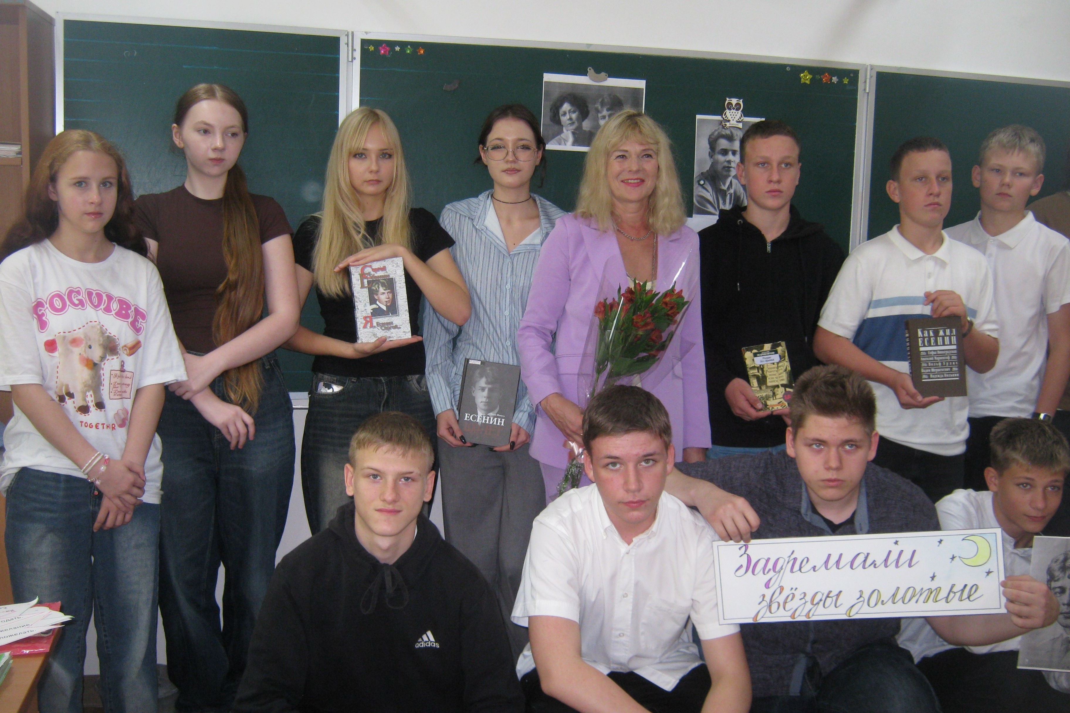 Школьники читали свои любимые стихи, одно из них он написал в 1914г. «Гой ты, Русь, моя родная», где есть и такие всем знакомые и наизусть заученные слова «Если крикнет рать святая: «Кинь ты Русь, живи в раю!» Я скажу: «Не надо рая, Дайте родину мою». Учитель литературы Светлана Станиславовна, не утерпев, прочитала свое любимое стихотворение «Клен ты мой опавший», да так проникновенно, что класс (9В) слушали свою учительницу на одном дыхании.