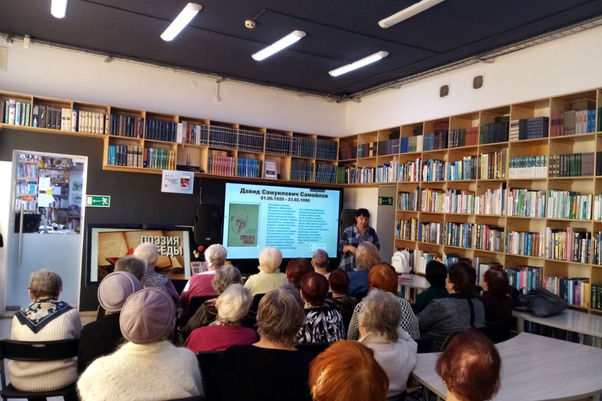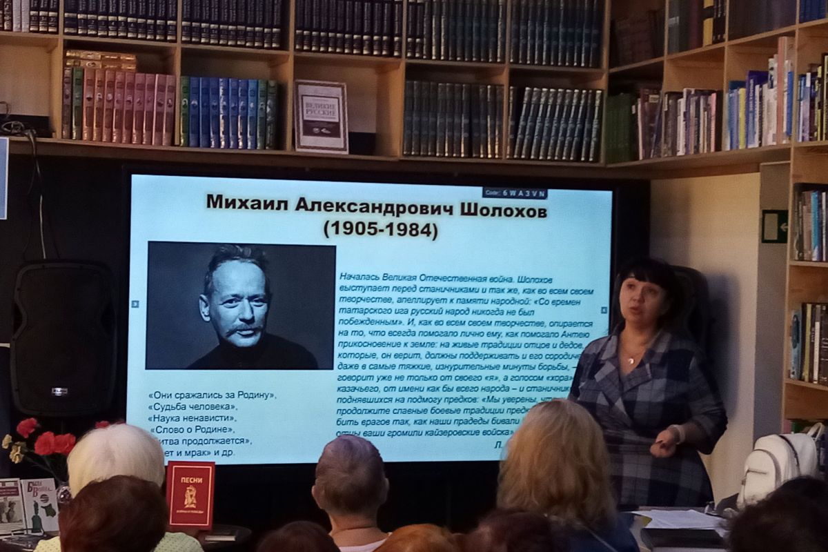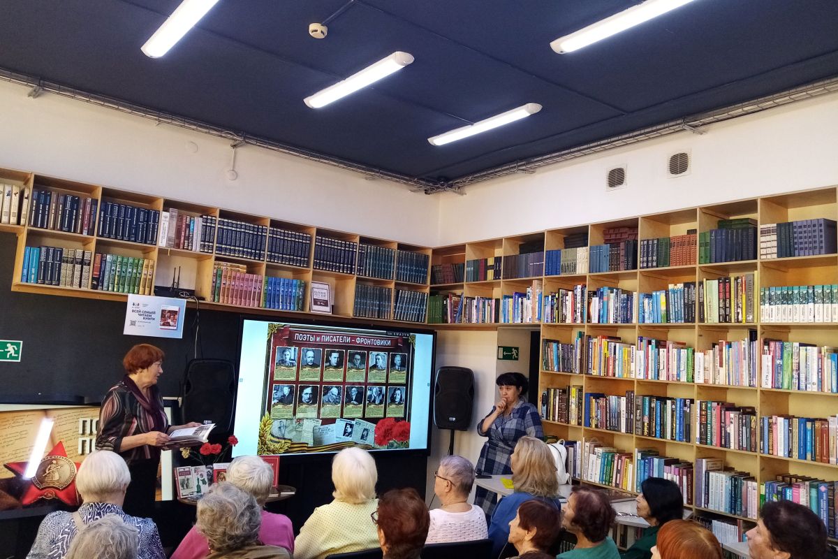 Участникам встречи она рассказала о поэтах-фронтовиках и писателях, бесстрашно шагнувших в зарево войны, чьи произведения были написаны в окопах, блиндажах, в военных эшелонах, в землянках после боя. В ходе беседы собравшиеся посмотрели видеоролики с песнями военных лет на стихи Р. Гамзатова, М. Исаковского, Б. Окуджавы, а также они слушали стихи А. Твардовского, Е. Евтушенко, К. Симонова, посмотрели отрывки из фильмов по произведениям Е. Носова, В. Распутина и других.