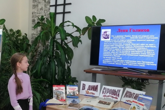 Об этом и о многом другом узнали четвероклассники из рассказа библиотекаря. Как же мы выстояли – главный вопрос. Ответ – подвиги героев войны, когда не только взрослые, но и дети вносили свою лепту в Победу. Один за другим выходят ребята и рассказывают о Лёне Голикове, Зине Портновой, Марате Казее и о многих других героях, заплативших жизнью за Победу.