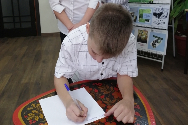 А затем прошла «акция памяти». «Что бы ты сказал ветерану войны, в его лице всем, кто не вернулся?» Ребята на одном листе, перегибая его, писали свои пожелания. А те, кому не хватило времени, продолжат это в классе. Зачитываем коллективное письмо полностью. «Мы победили, спасибо вам!», «В нашей семье помнят дедушку и дядю, прошедших войну», «Если случится, мы тоже постоим!» Письмо запечатано в треугольный конверт и будет хранится в классных документах, чтобы потом другие ребята, которые придут здесь учиться, читали и дополняли его.