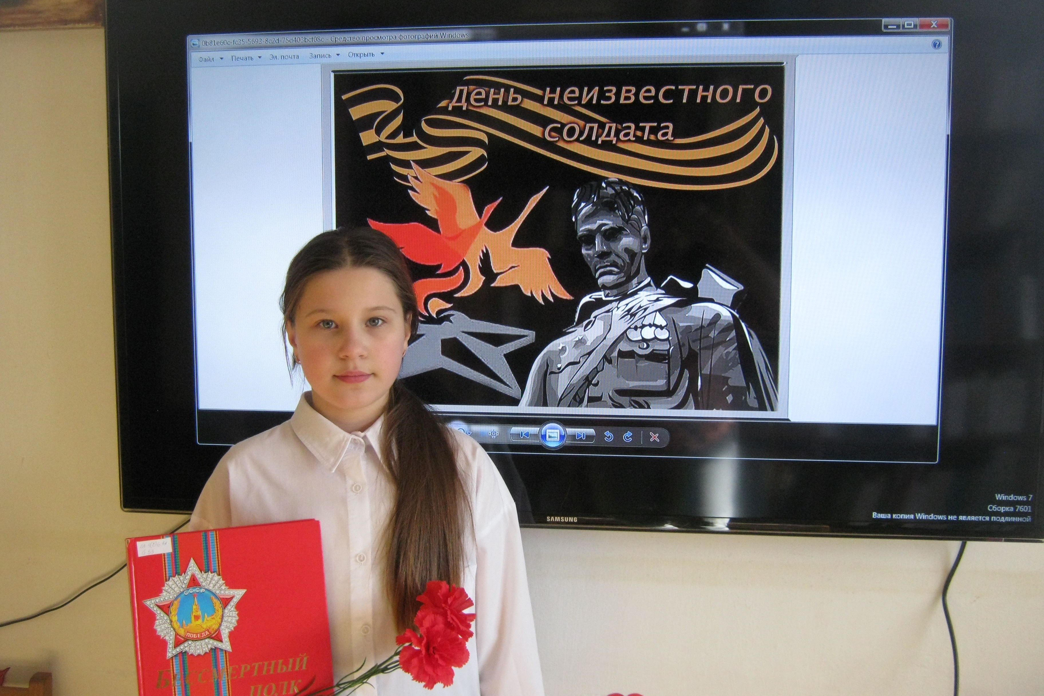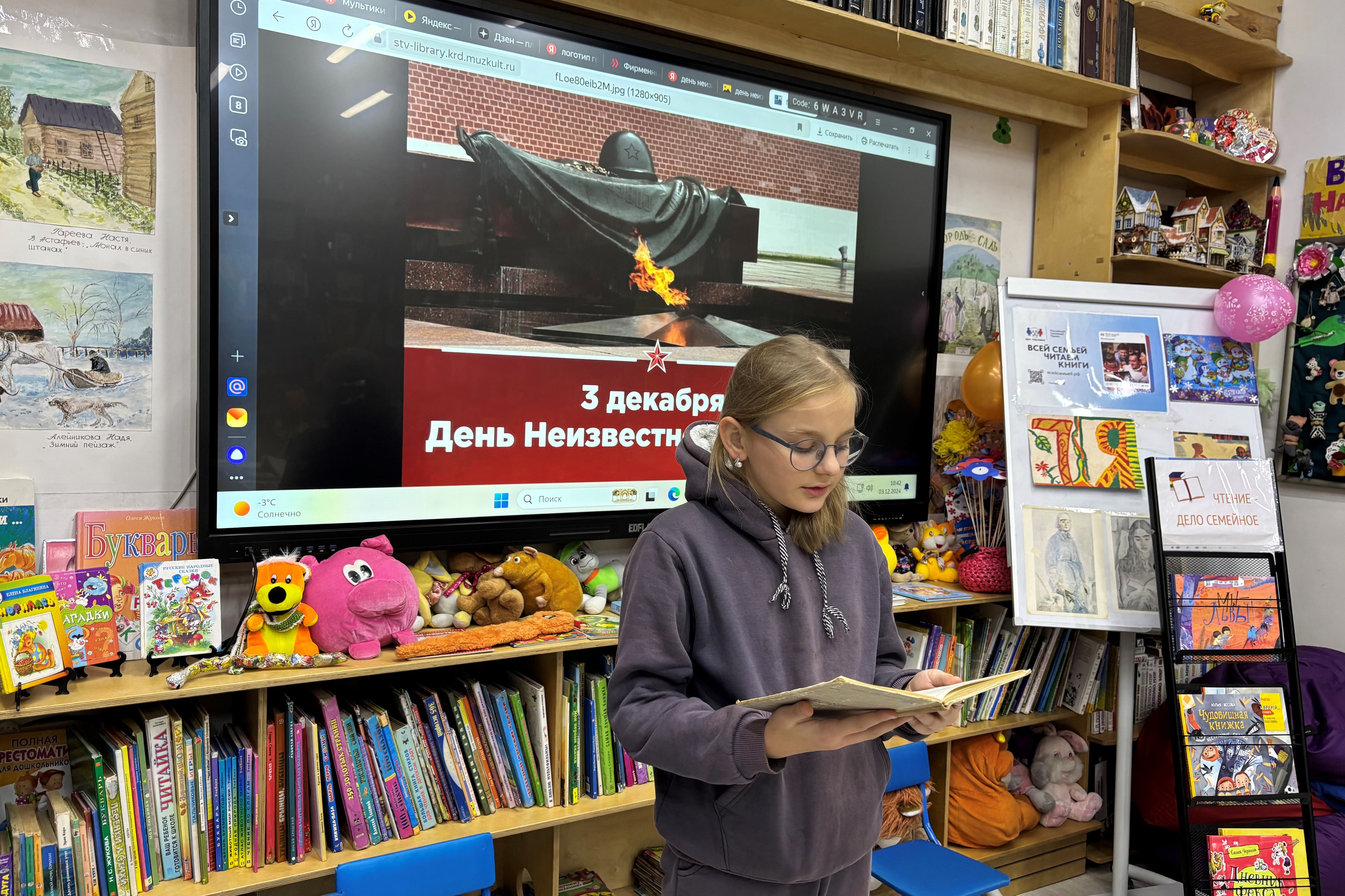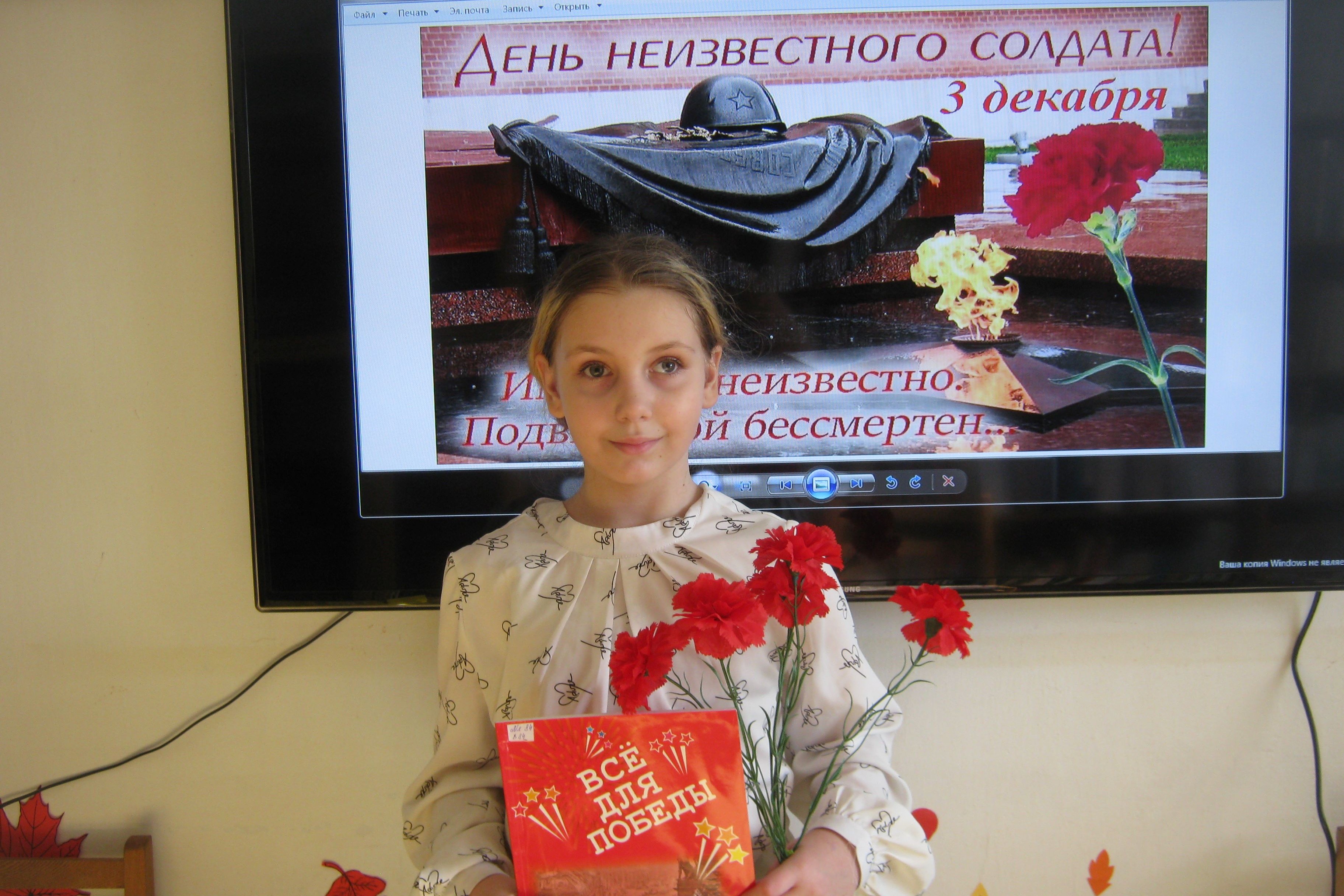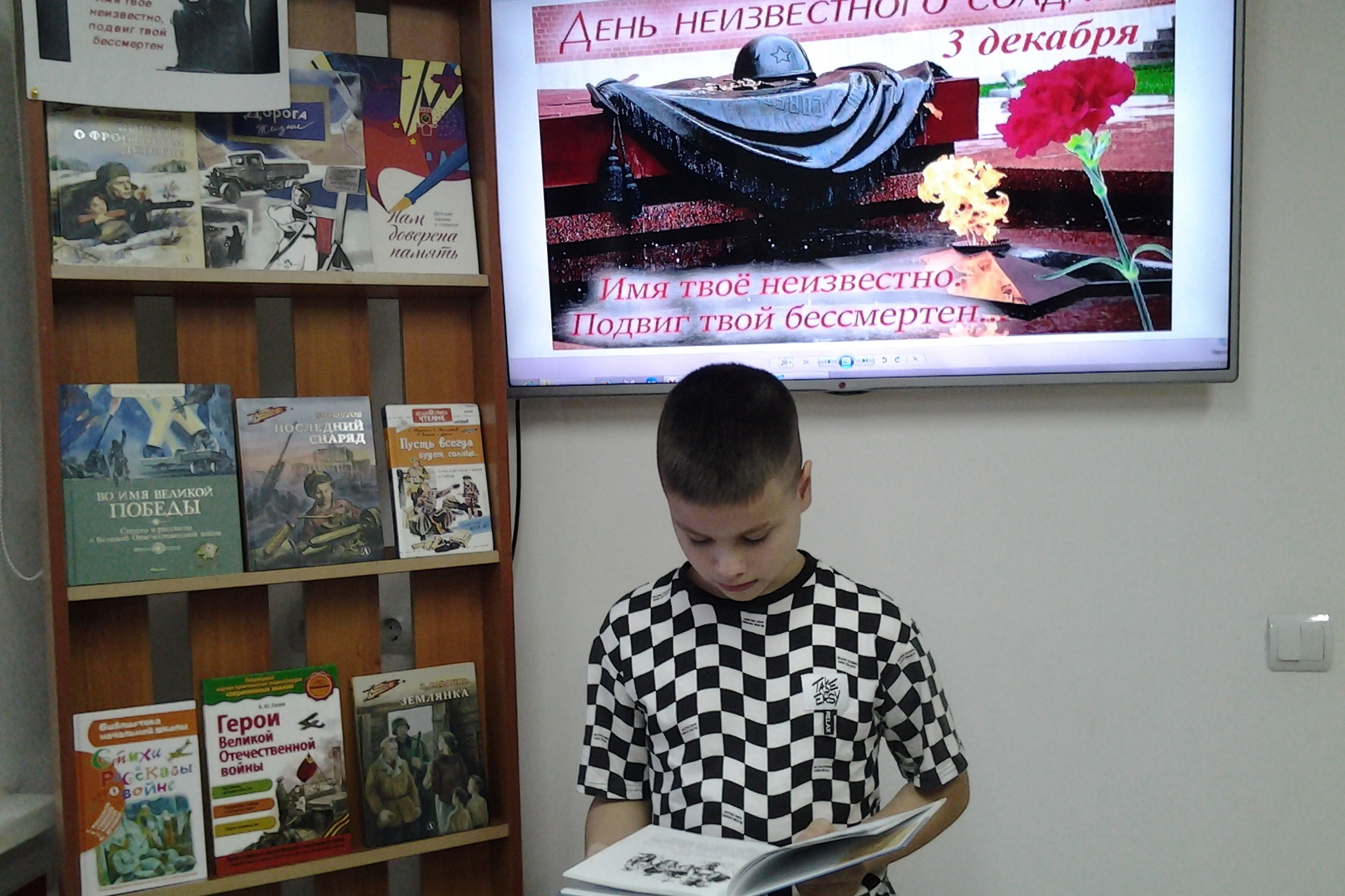 В детской библиотеке № 7 взрослые и дети знакомились с книгами о героях и подвигах Великой Отечественной войны. Они увидели главный военный мемориал Москвы – Могилу неизвестного солдата и послушали рассказ о том, что он был задуман как памятник всем павшим воинам, и в первую очередь тем, чьи имена так и остались неизвестными. Листали книги поэтов, которые написали проникновенные строки о неизвестном солдате, а потом читали стихи Сергея Орлова, Александра Говорова, Сергея Погореловского, Сергея Наровчатого, Михаила Дудина.