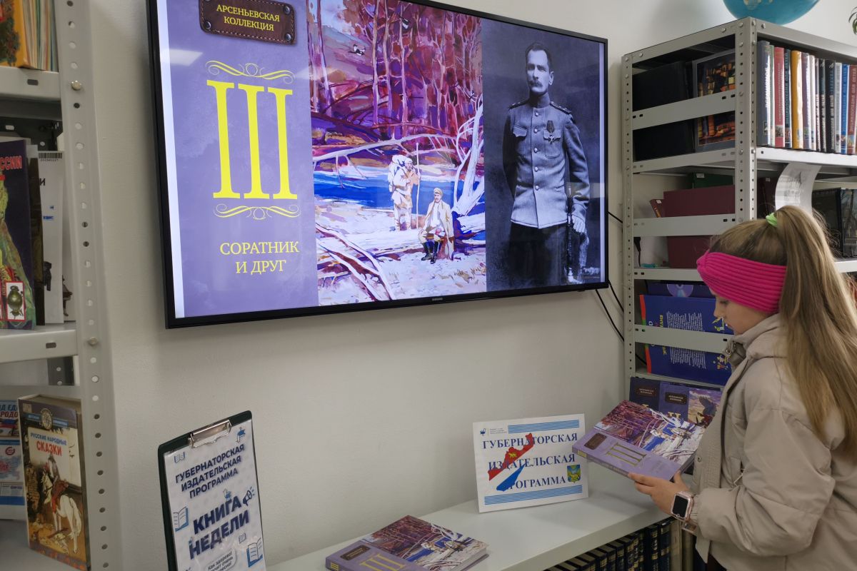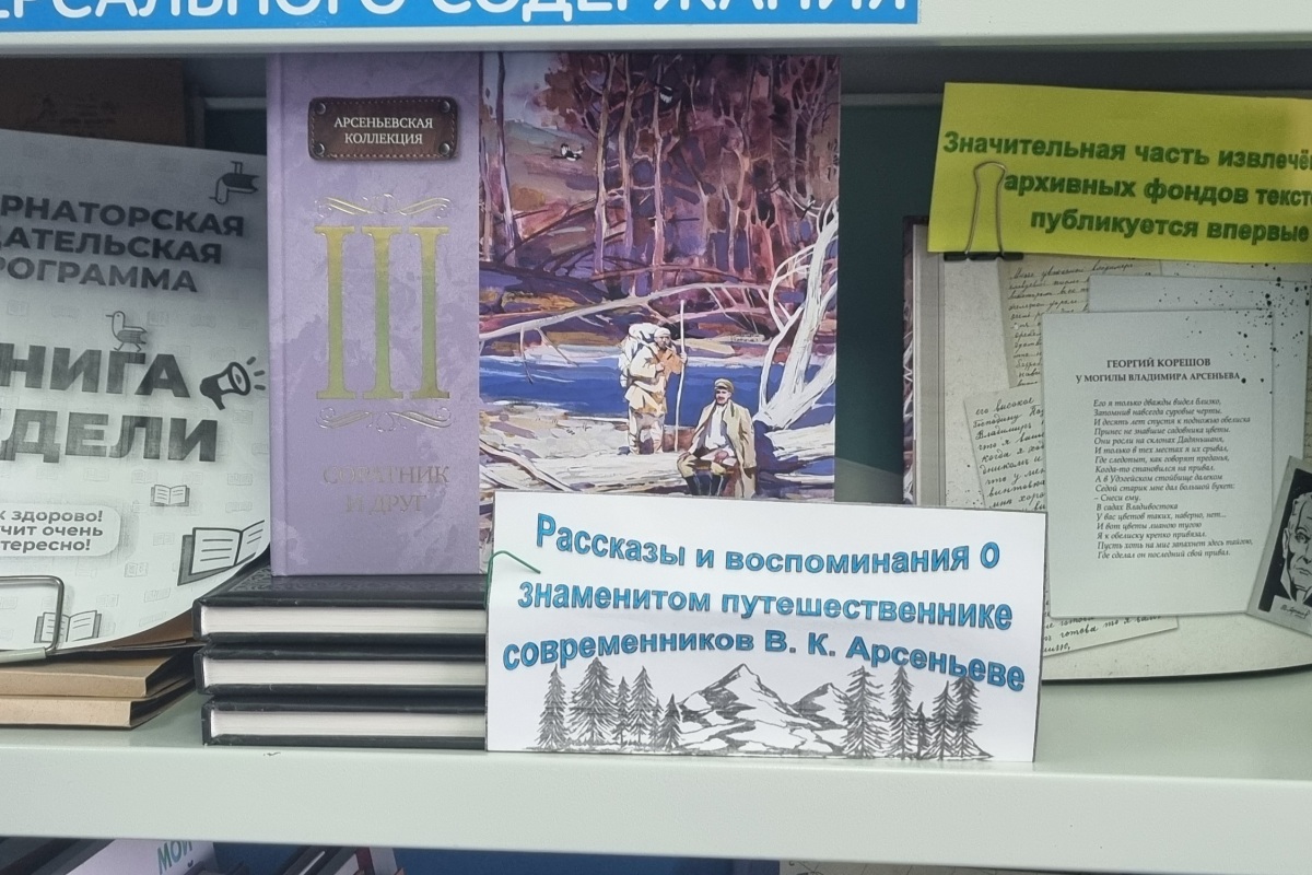 В рамках акции МБУК «Владивостокская централизованная библиотечная система» «Книга недели» посетителям широко популяризируются книги, изданные в рамках Губернаторской издательской программы. На прошлой неделе читателям библиотек представляли книгу «Соратник и друг: рассказы и воспоминания о знаменитом путешественнике современников В. К. Арсеньева». Это третья книга «Арсеньевской коллекции». В нее вошли воспоминания об Арсеньеве, многие из которых публикуются впервые. Рассказы и очерки, воспоминания об Арсеньеве родных и близких. Спутников по экспедициям, коллег и единомышленников. Тексты, извлеченные из архивных фондов, дают возможность полнее представить живой образ исследователя Дальнего Востока.