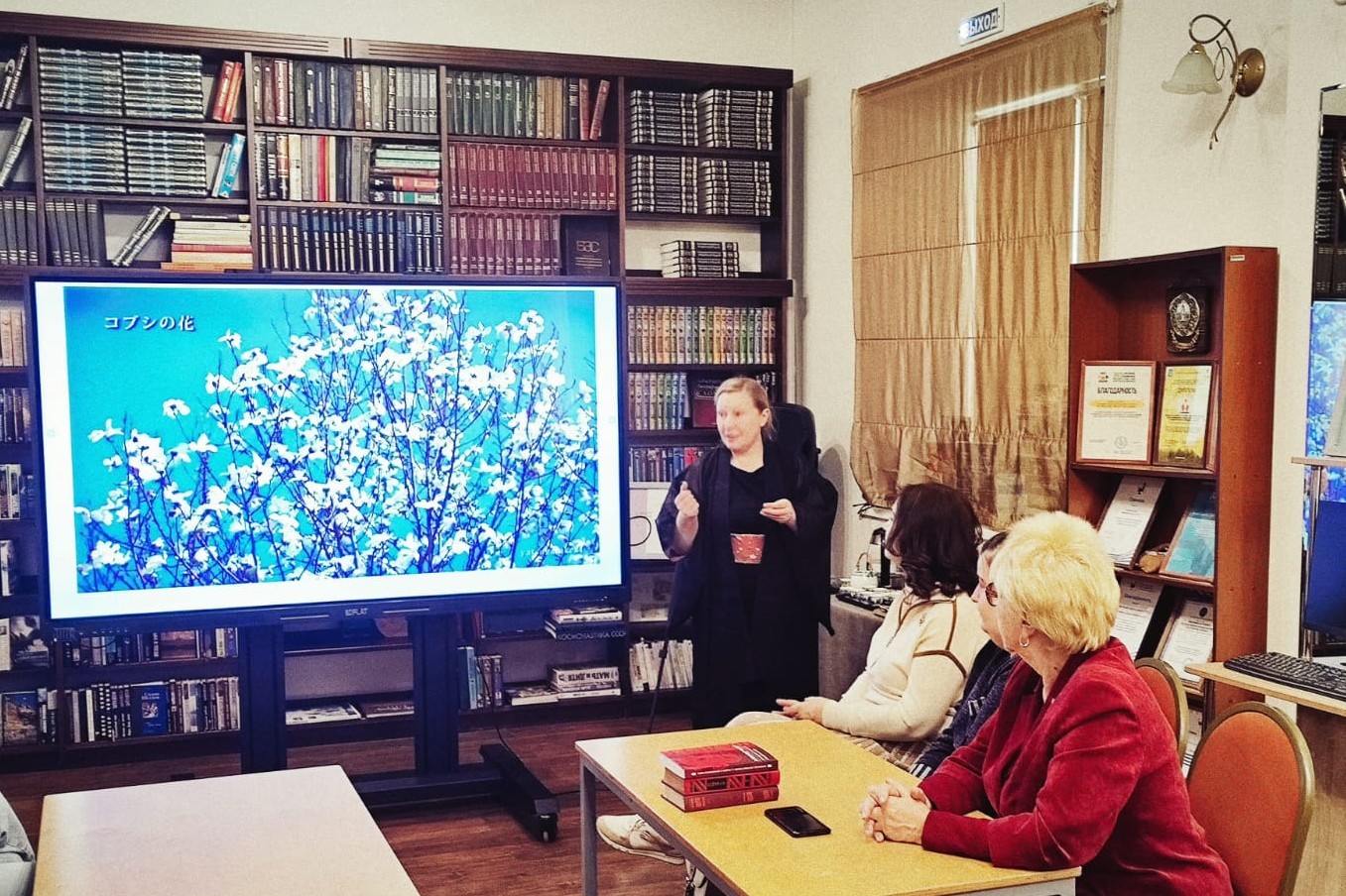 Любуясь весенними пейзажами, представленными на мультимедийной доске, гости попробовали «Сакура моти» с зелёным чаем «Сентя», а затем посмотрели короткометражный фильм о мастере вагаси из г. Канадзава.