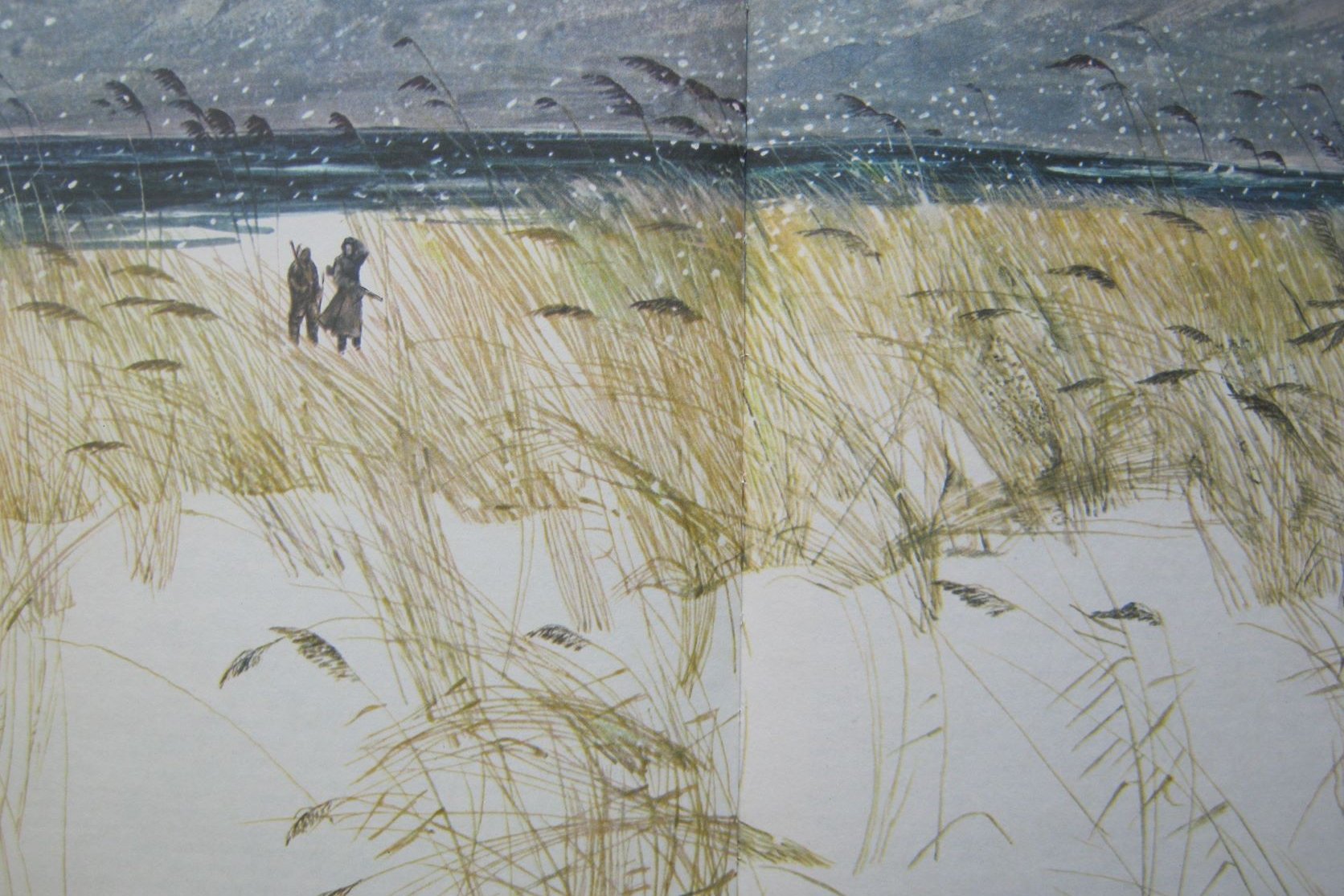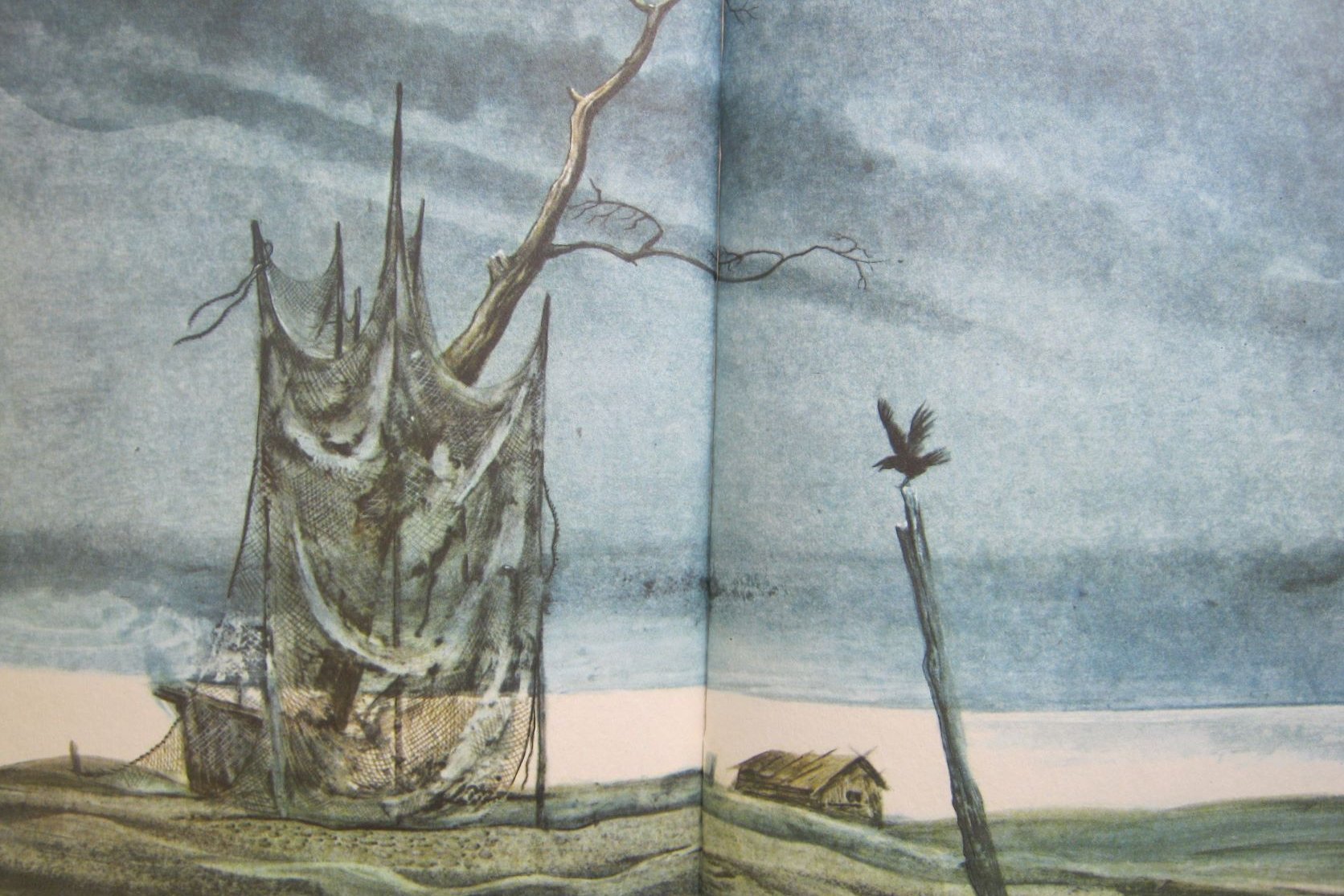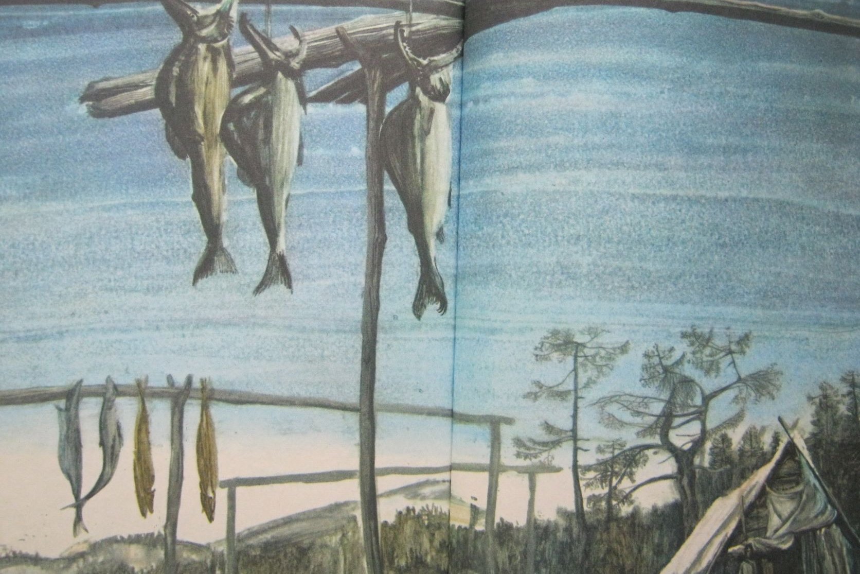 Когда я работал над Пришвиным, то решил ограничить себя двумя цветами. Вообще-то книги этой серии дорогая вещь, и, казалось бы, на все надо было использовать цвет. А я не стал. И какой-то московский искусствовед все-таки увидел потом, что я задумал: «Почему так художник делает? Видите, свет какой!». Я увидел у Пришвина в слове свет. Сначала у Кина «По ту сторону» свет, поэтому у страницы такой цвет. И у Пришвина свет, светлый образ, мне хотелось минимальными средствами дополнить этот воздух. Видите, какое свечение идет в рисунке? Более того, там есть иллюстрация, где я полосой определял цвет – белый цвет моря, неба и суши. Вроде бы белый, а разное качество белого. Да, я много кувыркался с этими иллюстрациями. Это вот Третья Рабочая, тут сейчас Комсомольская, ТЦ «Галерея», вниз идешь, полиграфкомбинат. А вот здесь цветочный ряд был, он уничтожен уже. Будочка осталась, кусочек. Сейчас это закрыли, проход был, тут цветы продают. Это с натуры зарисовка, в книге две или три такие. Тут тополя стояли. У меня на эту тему много акварелей.
