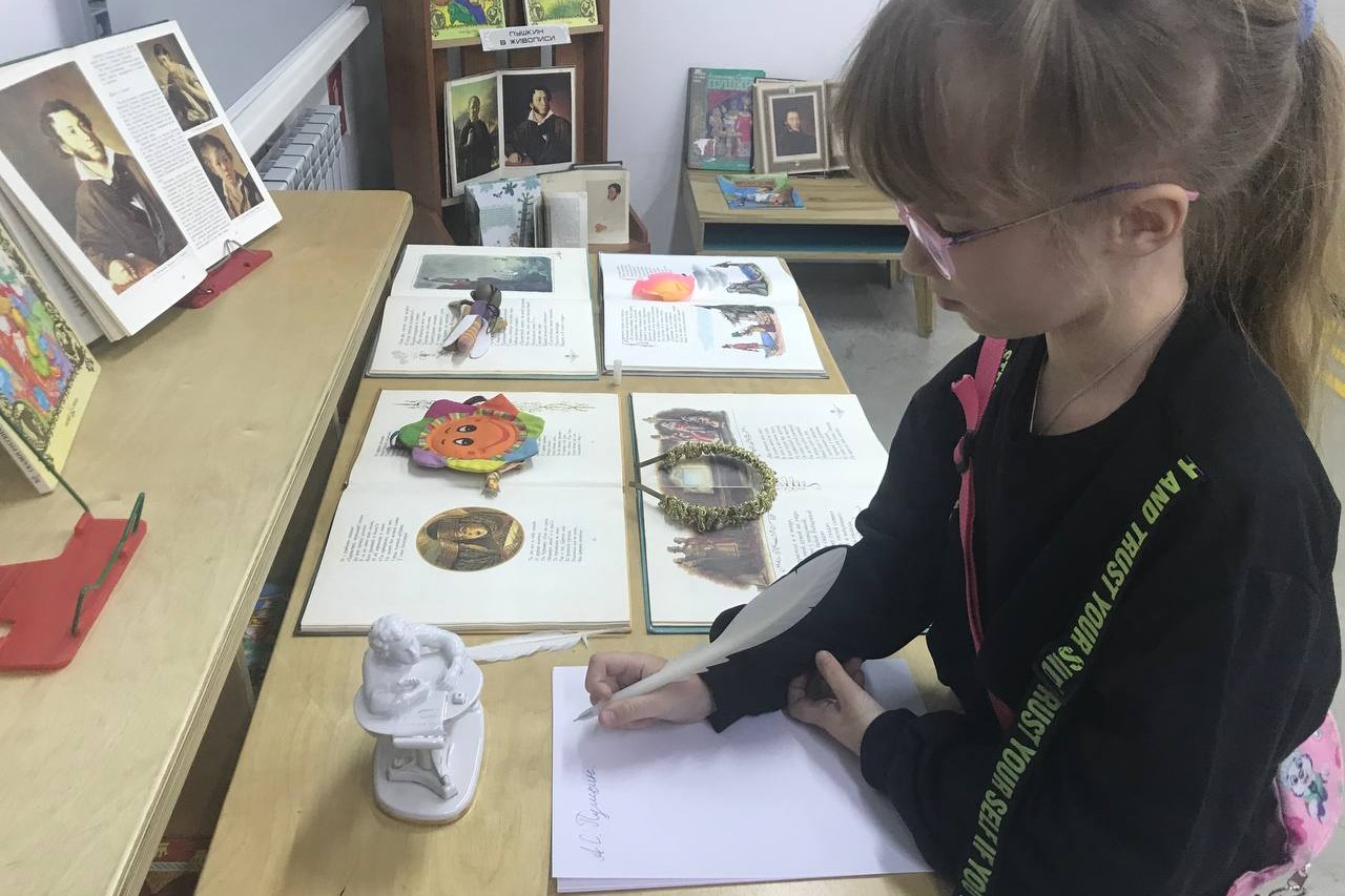 6 июня ребята из пришкольного лагеря школы № 6 пришли в детскую библиотеку № 5 поздравить Александра Сергеевича Пушкина с днём рождения. А каким же был мальчик Саша? Хорошо ли он учился? Сколько друзей у него было, когда он был ребёнком? Очень хотелось получить ответы на все эти вопросы… Ребята окунулись в атмосферу сказок и чудес! Они писали пером красивым почерком, как у Пушкина. Превращались в старика и рыбку, в самолюбивую царицу и волшебное зеркало, в комара и царевну лебедь. Отгадали викторину по сказкам и каждый нарисовал свой портрет Александра Сергеевича, каким он представился им теперь.