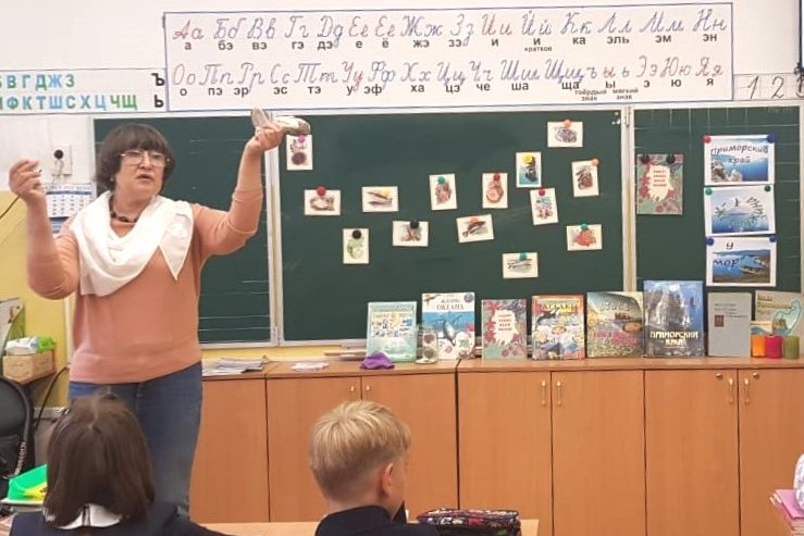 После беседы о географическом положении Приморья, где отметили его юго-восточное положение, и то, что на юге и востоке его территория омывается теплым Японским морем, а половина границ (1350 километров или 839 мили) – морские, рассмотрели схему течений, указали, что окраинное море Тихого океана – Японское – самое солёное море России, а соленость его вод составляет в среднем 33 промилле. Выяснили, что не только растительный и животный мир суши края представлен богатой смесью южных и северных видов, но и подводный мир Японского моря.