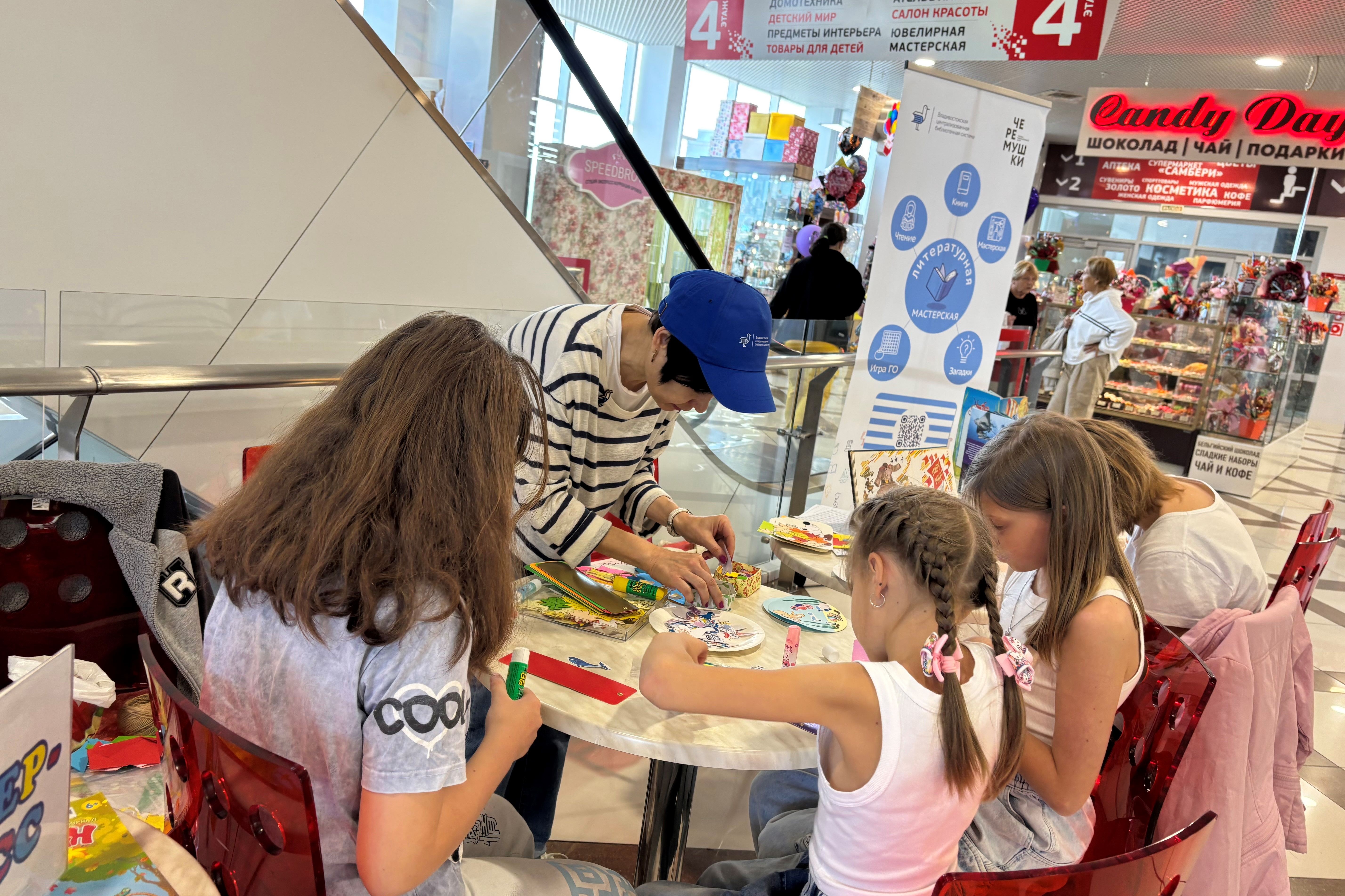 Отправляясь в торговый центр, горожане планируют сделать покупки. Но торгово-развлекательный цент предлагает попутно и ряд других услуг, за которые не надо платить. Нужно только потратить немного времени, но, если увлечешься, так и в течение трех часов можно заниматься полезными и увлекательными делами. Например, творчеством – изготовлением различных поделок, развивающими играми, а также познакомиться с удивительными книгами. Все эти услуги в рамках работы открытой библиотечной площадки «Литературная мастерская» предлагают муниципальные библиотеки Владивостока. Каждую субботу с 12.00 до 15.00 на четвертом этаже ТРЦ «Черёмушки» (ул. Черёмуховая, 15).