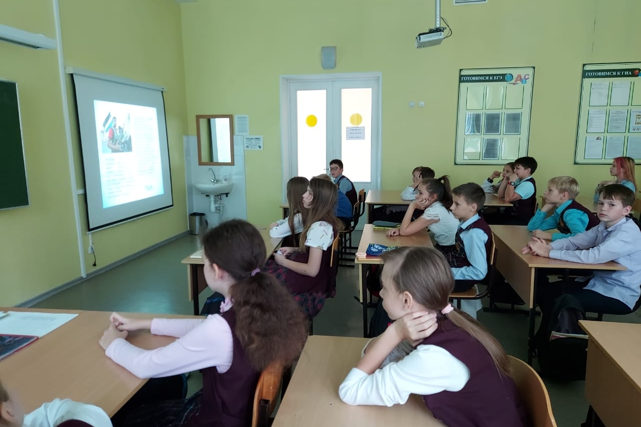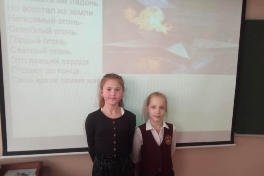 Ребята подготовили инсценировку «Малиновое одеяло» по воспоминаниям «блокадницы» Розулии Лысенко из книги «Память сердца». Роли исполняли Алина Моисеева, Лида Ваймугина, Лиза Бабий, Вера Мальцева. Илья Самойлик и Назар Никитин прочли стихи, посвящённые памяти Неизвестного солдата. Завершился урок Минутой молчания.