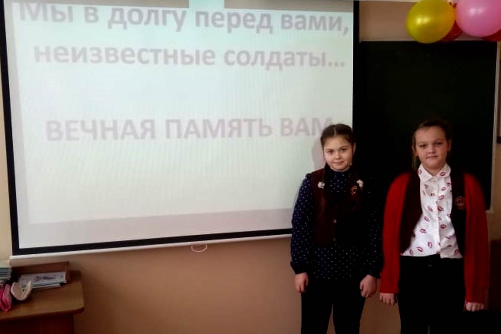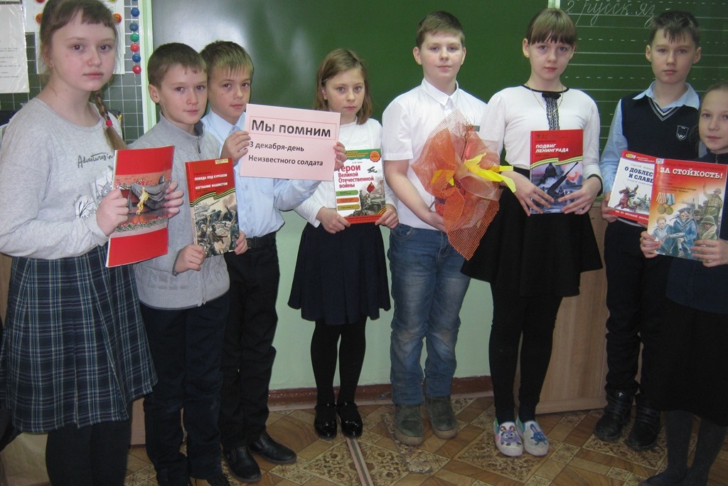 3 декабря библиотека №15 организовала для учащихся 4 «А» класса школы №54 патриотический урок, посвященный Дню Неизвестного солдата. Это не только день памяти погибших в годы Великой Отечественной войны, но и дата, которая объединит всех погибших и пропавших без вести во время войн и военных конфликтов. Помним, потому что знаем о нелегкой победе воинов, которые защищали свои родную землю от захватчиков. Ребята не только слушали сообщение лектора, но и сами активно участвовали в мероприятии: Шмыков Степан рассказал о сражении на «Курской дуге», он много читал и смотрел передачи о танковом сражении. А Дежнева Наташа прочитала стихотворение Михаила Светлова «Неизвестному солдату».