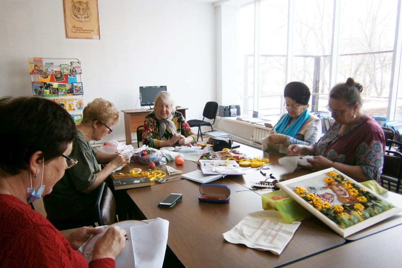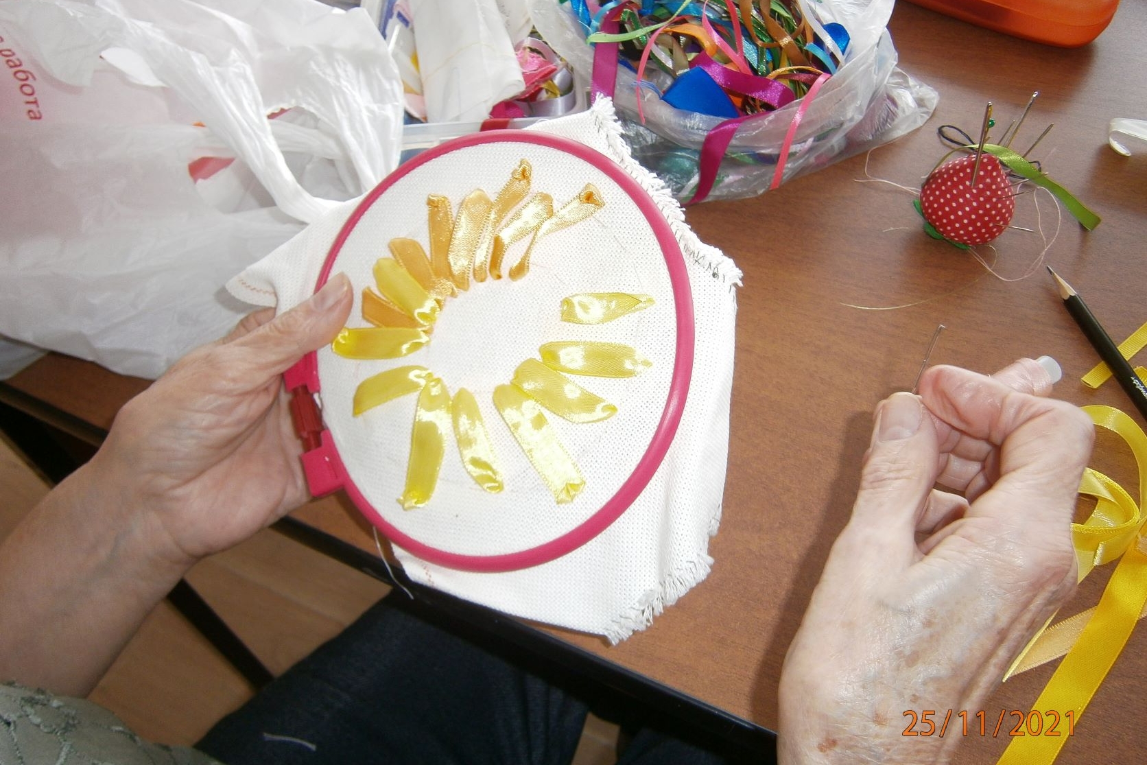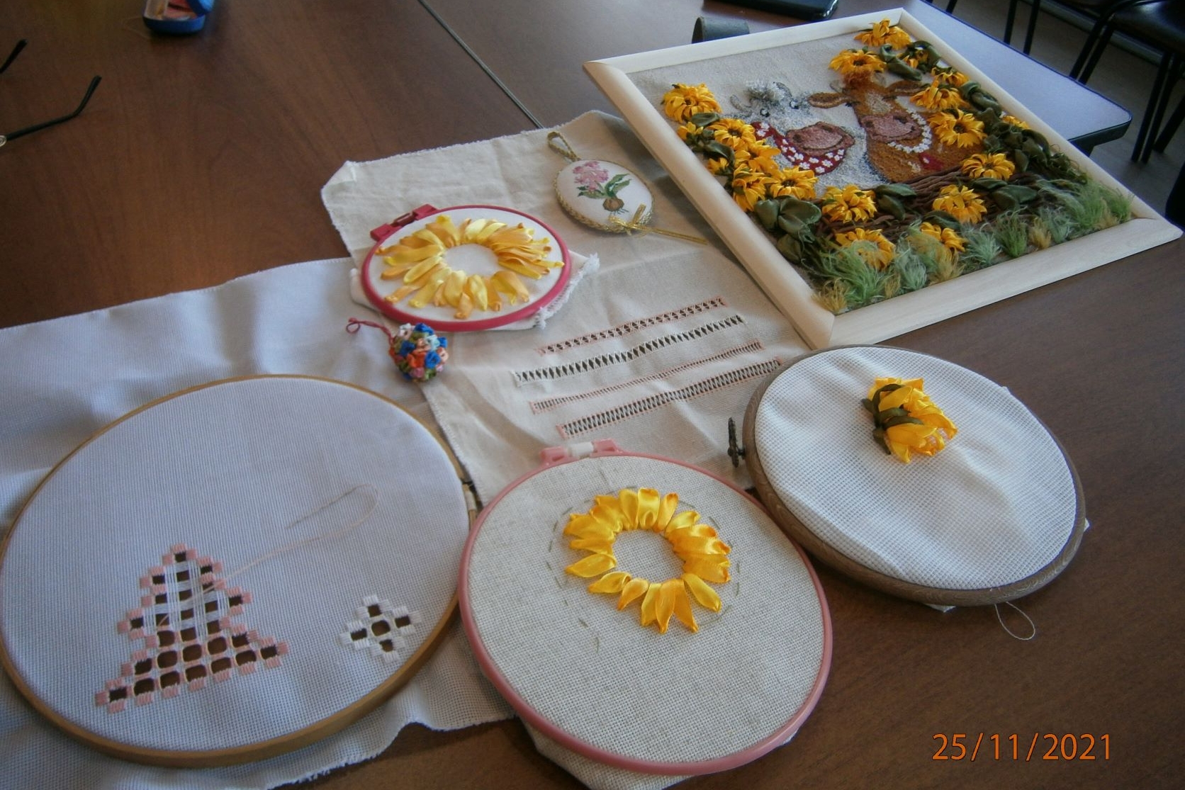 Творческая мастерская «Руками вышитое чудо» в библиотеке № 3 — чудесная возможность не просто заниматься делом, которое нравится, но и пообщаться, обменяться и вопросами творчества, и делами житейскими. 25 ноября участницы творческой мастерской оттачивали свои навыки. Кто-то вышивал салфетки, обрабатывал уголки, делал красивую кайму. Другие работали с лентами и начали вышивать подсолнушки. У каждой ученицы свой подход к вышивке. Конечно, на занятии идет интенсивный обмен идеями и демонстрация домашних работ.