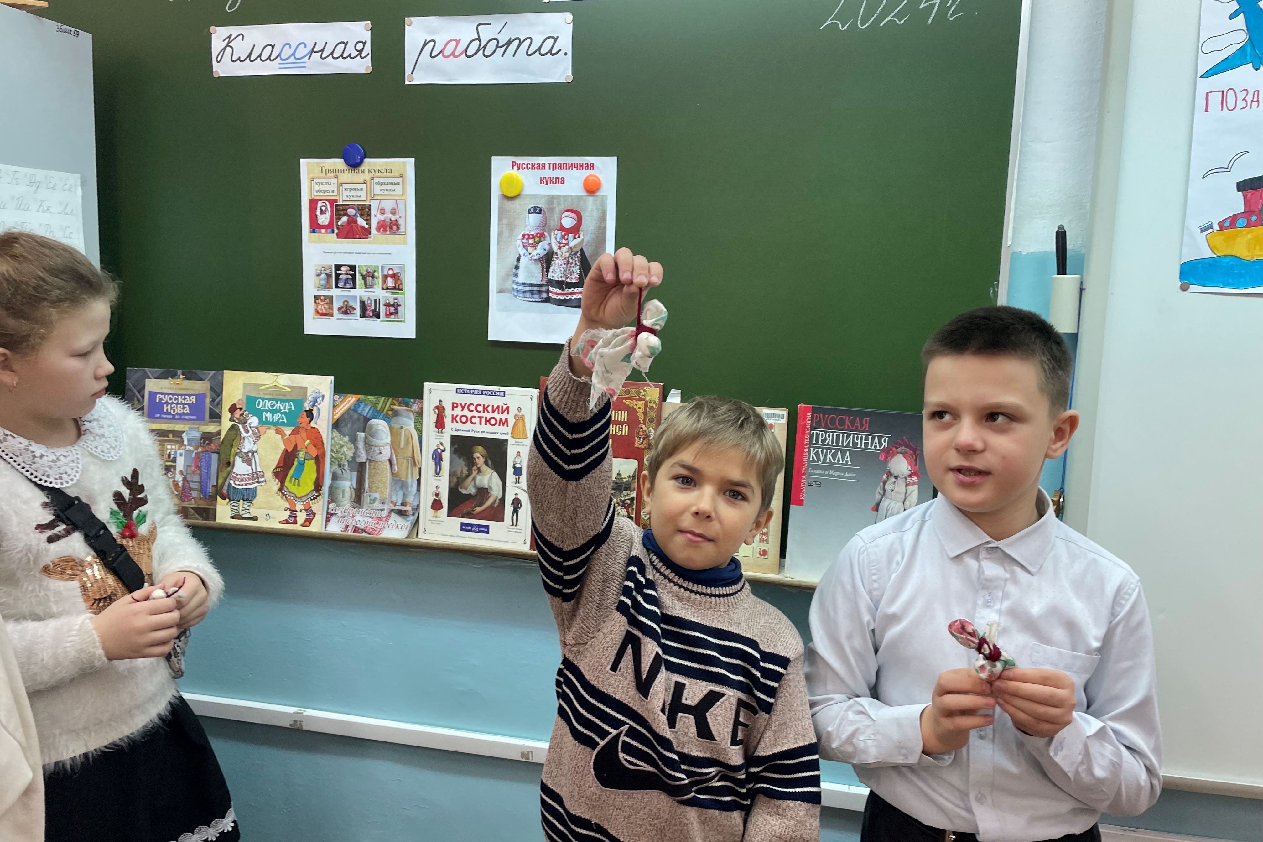 31 января ученики 3 «А» класса школы № 59 под руководством сотрудников Детской библиотеки №7 учились мастерить тряпичную куклу. Такие занятия проходят в классе уже не первый раз, дети ждут таких занятий, готовятся к ним. На этот раз они мастерили куколку под названием «отдарок-на-подарок», но вначале послушали интересные истории из книги Ирины Колпаковой «Возвращение мудрости предков» и книги серии «Настя и Никита» «Русская изба. От печки до лавочки».