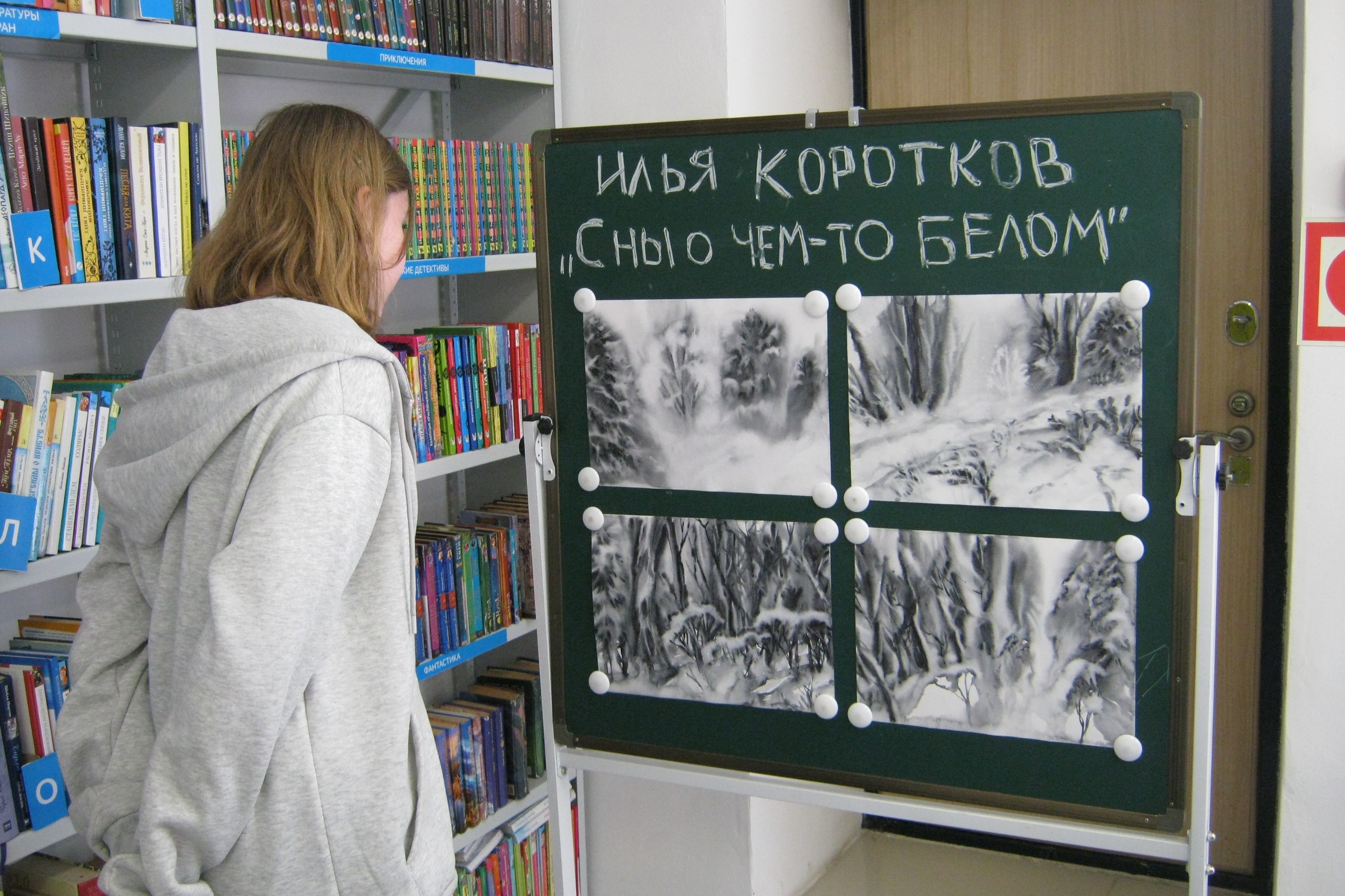 В конце марта в библиотеке №8 открылась выставка графики Ильи Короткова «Сны о чем-то белом». Шестого апреля выставку посетили воспитанники центра развития творчества детства и юношества. Эта группа подростков регулярно посещает занятия в изостудии ЦРТДиЮ и по рекомендации руководителя студии приходит поглядеть на те выставки в библиотеке, авторы которых также посещают изостудию. Илья Коротков (на общем снимке* в центре), как и его друг и партнер по Giraffe studio Ирина Попович, ранее уже выставлявшаяся в галерее библиотеки, ходит в студию народных художников в ДКЖД. Графика, выставленная в библиотеке №8, представляет собой серию зимних пейзажей по мотивам заснеженного Ботанического сада. Илья родом из города Советская Гавань и, хотя уже давно живет во Владивостоке, но помнит, что весна в Совгавани наступает позднее, чем у нас. Поэтому, не смотря на апрель, в библиотеке выставлены зимние пейзажи – по совгаваньским меркам сейчас еще зима.