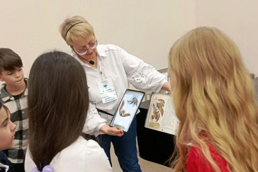 Во второй части праздничной программы детям демонстрировали книги различных форматов – это были и книжки-малышки, и книжки-раскладушки, и даже книга, которая была издана 200 лет назад, а также знакомили детей и педагогов с новыми книгами, которые бывают не только традиционные – с текстами и иллюстрациями, но и такие, как книга «Невельской: плоды воображения» — графический роман в азиатском стиле. Или с дополненной реальностью, как знаменитая детская книга Владимира Клавдиевича Арсеньева «Встречи в тайге». Детвора и взрослые с удивлением и восторгом наблюдали за тем, как оживали книжные иллюстрации, слушали шум деревьев в тайге и голоса животных и птиц.