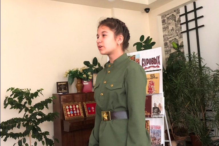 Композицию, посвящённую Дню Победы, открыла Светлана Дегтярёва, выпускница театрального отделения института Искусств, чтением отрывка из поэмы Р. Рождественского «Двести шагов».