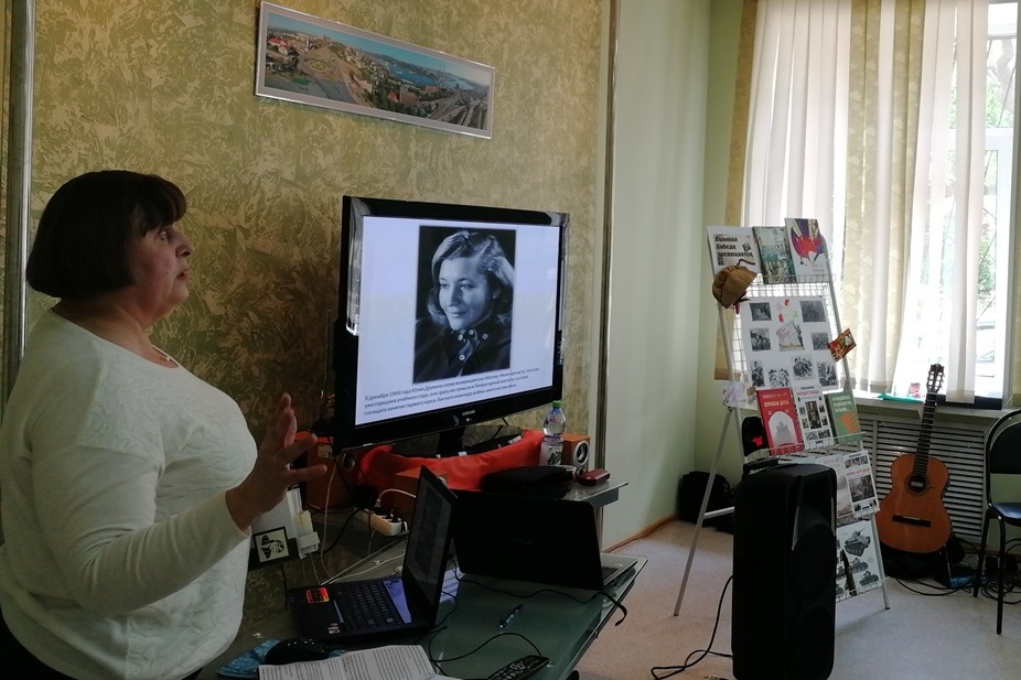 7 мая в библиотеке им. Н.Н. Муравьева-Амурского встреча Союза Пенсионеров Первомайского района традиционно посвящена празднику Великой Победы. В этот день читатели старшего возраста поздравили приглашенных ветеранов Великой Отечественной войны с наступающим праздником и вручили им памятные подарки. Дети из вокальной группы «Ария» (руководитель Шестак Елена Валерьевна) из детского клуба «Гренада» так же выразили свои пожелания всем присутствующим и исполнили песни, посвященные Дню Победы. Сотрудники библиотеки подготовили литературно-поэтическую композицию «Планета «Юлия Друнина», посвященную 95-летию со дня ее рождения. Рассказали о жизни советской поэтессы, о творчестве, в котором она смогла показать войну глазами женщины и, конечно, о Великой Победе. Завершилась встреча памятными песнями, посвященными Великой Победе.