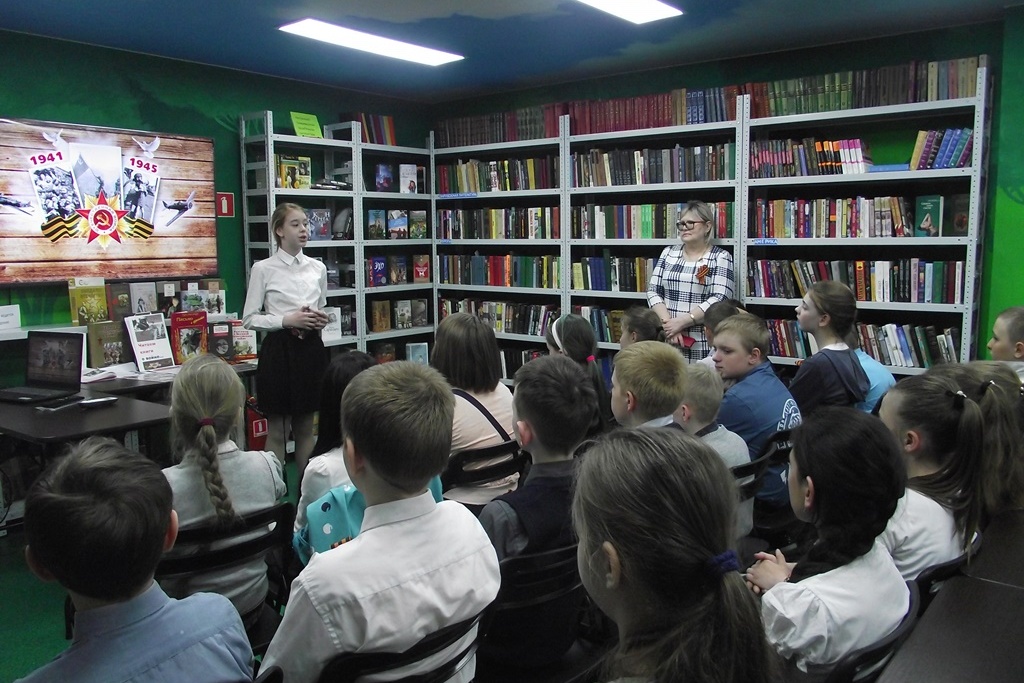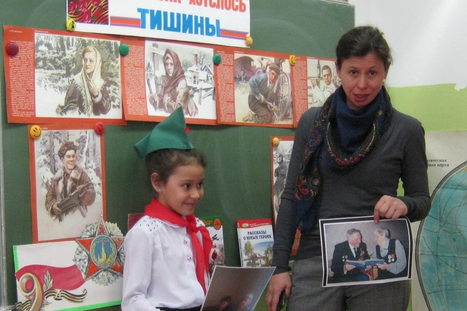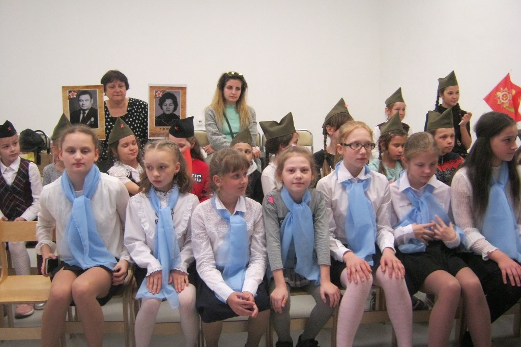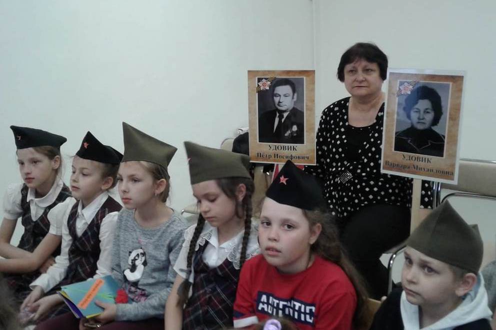 Второклассники школы №54 в библиотеке № 15, подготовили рассказы о юных детях-героях. Каждый выучили и текст, рассказывающий о подвиге пионера, и стихи, посвященные героическим именам. Ангелина Бушля и ее мама Юлия Станиславовна рассказали о своей бабушке, работающей на колхозных полях в 11 лет. Рассказали и о дедушке Савченко Иване Станиславовиче, участнике Великой Отечественной войны, дошедшего до Берлина, поднимавшегося на крышу Рейхстага.