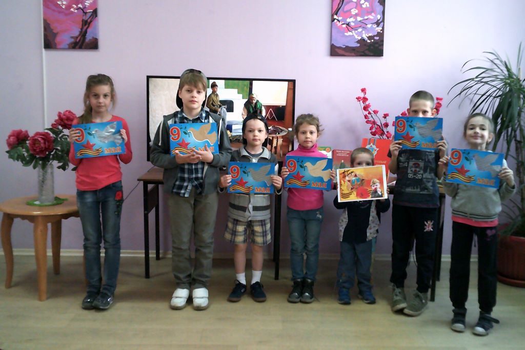 4 мая в этой же библиотеке прошел час памяти «Ради жизни на земле». Юные читатели посмотрели видео спектакль детской театральной студии «Лицедеи» по рассказу В. Астафьева «Солдат и мать». Дети рассказали, что они знают о той войне. Смотреть военный парад они все пойдут с изготовленными ими плакатами, на которых светящийся в лучах солнца символ мира – голубь, георгиевская лента и памятная всем дата – 9 мая.