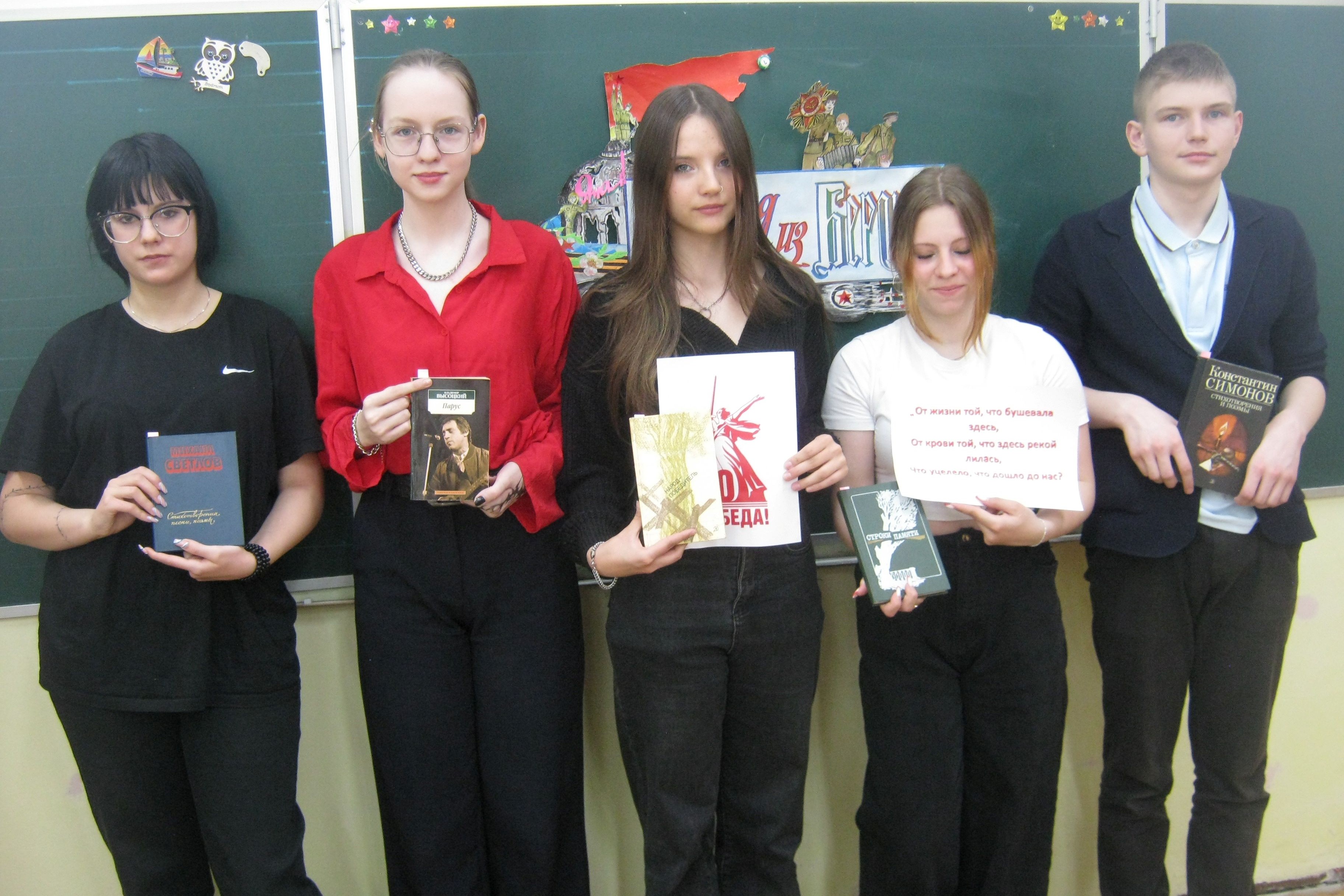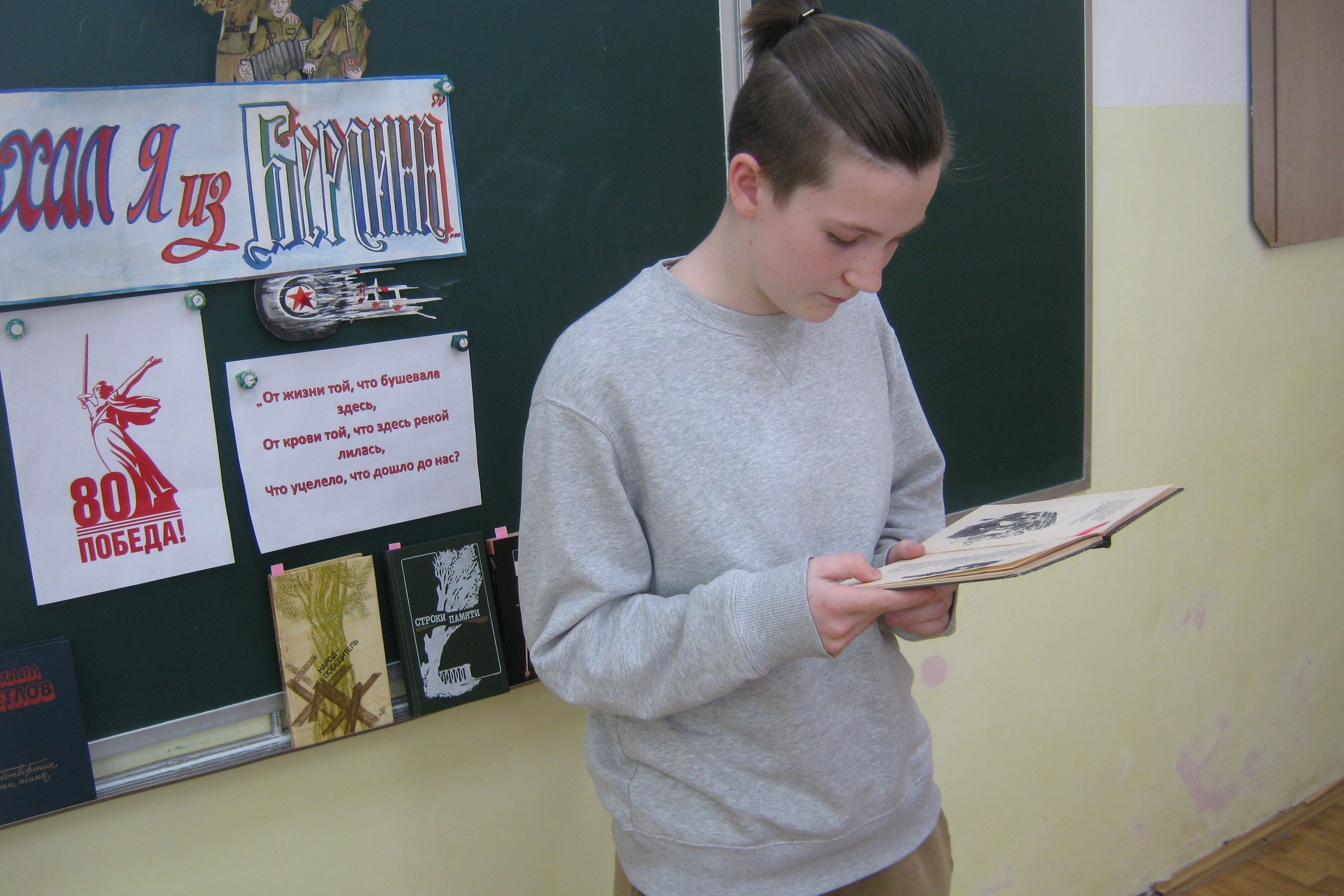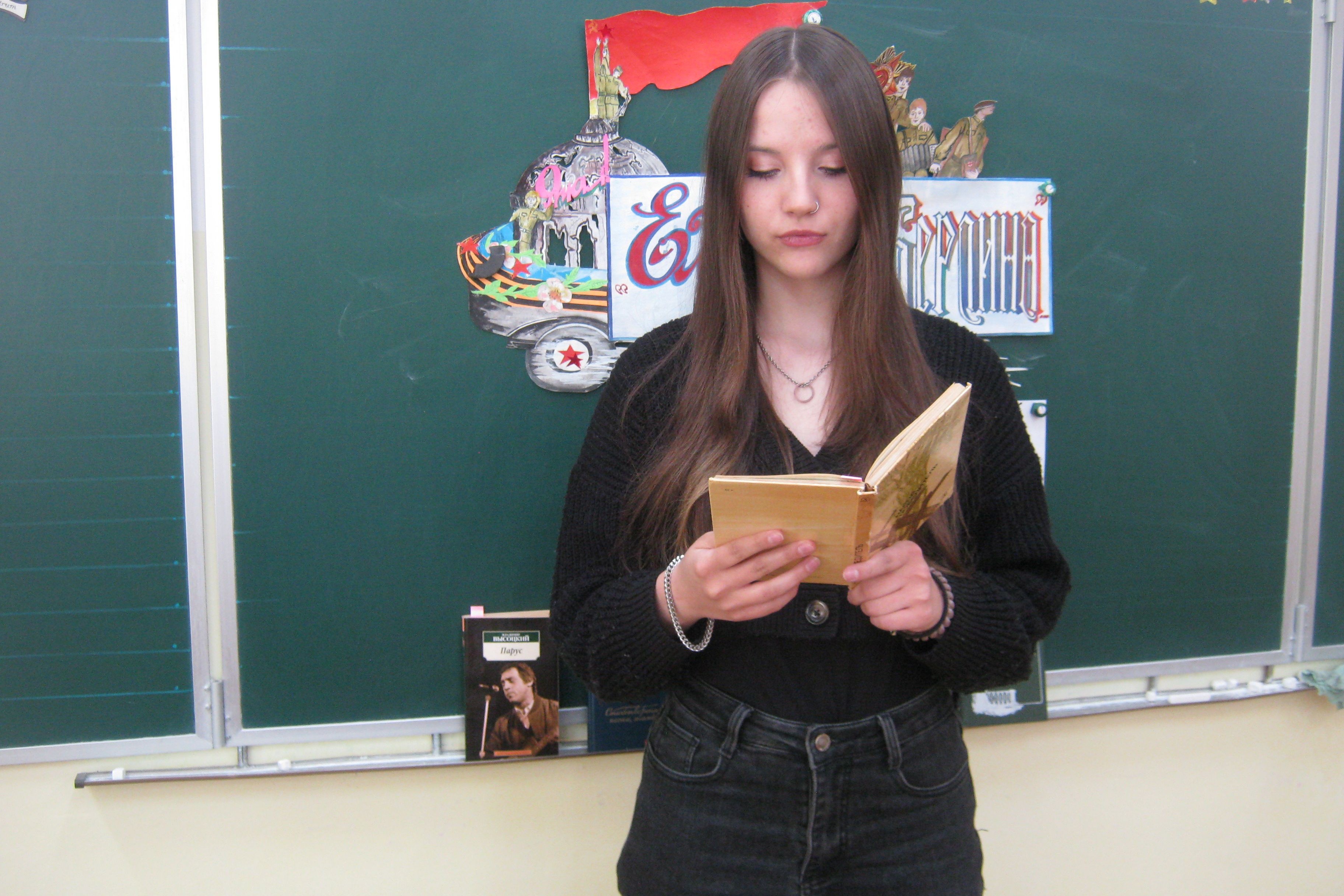 «Жди меня, и я вернусь» (1941) Константина Симонова — реквием – набат всем ждавшим своих любимых с войны. И голос Носовой Ангелы звучал уверенно, призывно, лирично. Но бывает и так, что солдата не дождались… М. Исаковский «Враги сожгли родную хату» (1945), написал полное горести и отчаяние стихотворение о солдате вместо дома, нашедшего «травой заросший бугорок». Стихотворение прочитала Марина Белых при полной тишине в классе. Восьмиклассники читали стихи Юрия Воронова, Виктора Максимова, Алексея Суркова «Землянка», Я. Шведова «Смуглянка».