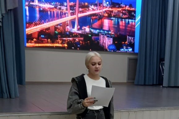 В ходе беседы выяснилось значение Владивостока как важного культурного центра на Дальнем Востоке нашей страны. Ребята читали стихи и слушали песни наших приморских авторов: Галины Якуниной, Светланы Абдарахмановой, Владимира Цветкова, Димы Графа, Владимира Синенко и с удовольствием делились своими впечатлениями. Тема вдохновения, которую даёт наш своеобразный город, не только важна творческим людям, но и нам, слушателям-зрителям. На экране прошли ландшафты города, памятники историческим деятелям, архитектурные объекты.