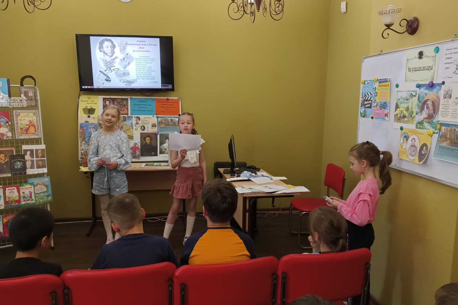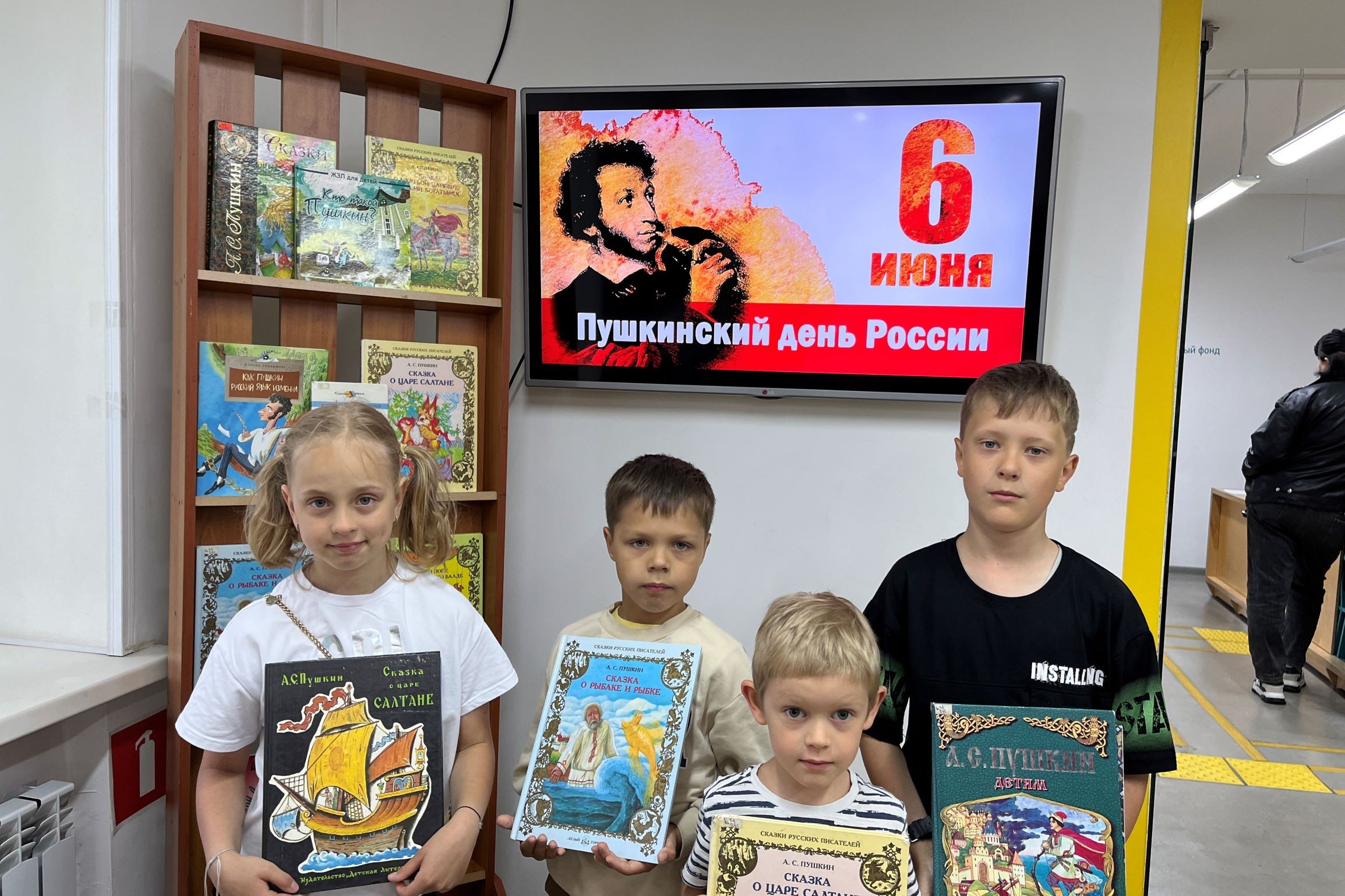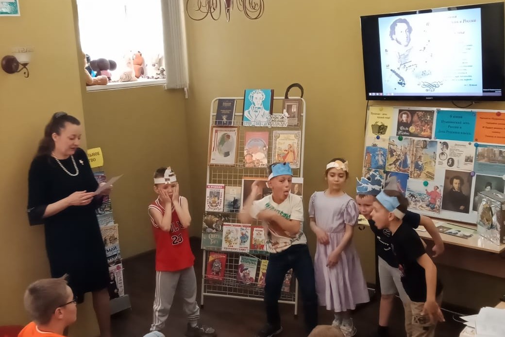 Библиотека № 4 пригласила ребят из пришкольного лагеря «Восточной школы» вместе встретить значимый в культурной среде праздник. Школьники с удовольствием познакомились с богато иллюстрированной нескучной книгой «Кто такой Пушкин?» М. Погореловой (серия ЖЗЛ для детей). Основную часть мероприятия посвятили творчеству поэта, стихам и любимым сказкам. Дети очень серьёзно отнеслись к конкурсу чтецов и прочли по памяти знакомые по школьной программе стихотворные отрывки, а также прочли предложенные библиотекарем стихотворения о природе из романа «Евгений Онегин» и строки, посвящённые няне поэта. Лучший чтец Игорь получил в подарок мягкую игрушку — чёрного кота учёного. Наши юные гости приняли участие в пантомиме и изобразили как менялось море в Сказке о рыбаке и рыбке, следом отгадали отрывки из сказок и раскрыли тайну волшебных предметов.