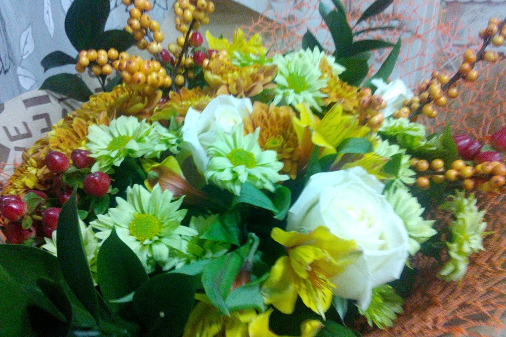 Букеты очень красивые и всегда такие разные. Я собрала галерею фотографий этих приятных моментов – роскошных цветов. Каждый букет напоминает мне о тёплых чувствах, дарит минуты счастья, улыбки и радость. И мгновенно пропадает усталость и хочется любить, творить, мечтать и просто — ЖИТЬ! И невольно вспоминаешь стихотворные строки поэта Андрея Дементьева