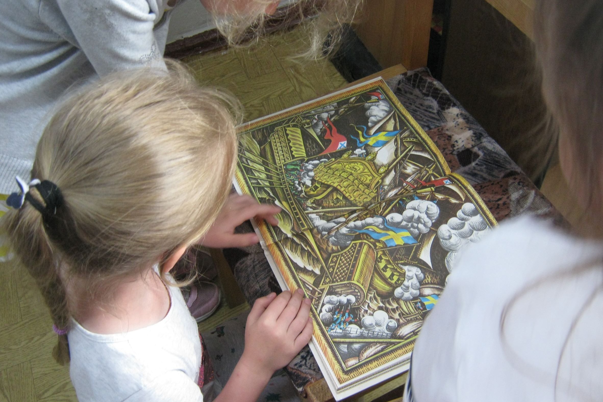 Прослушав информацию, дети рассматривали иллюстрации обороны Севастополя, сражений на море, картины художников, изображавших П. Нахимова в разные периоды жизни. Анатолий Митяев в книге «Рассказы о русском флоте» очень точно и доступно описывает сражения под командованием Нахимова. «Книга будущего адмирала» /Кацаф А. М./ рассказывает о всех полководцах морей и океанов, она особо интересна мальчикам, которые планируют выбрать профессию морского офицера.