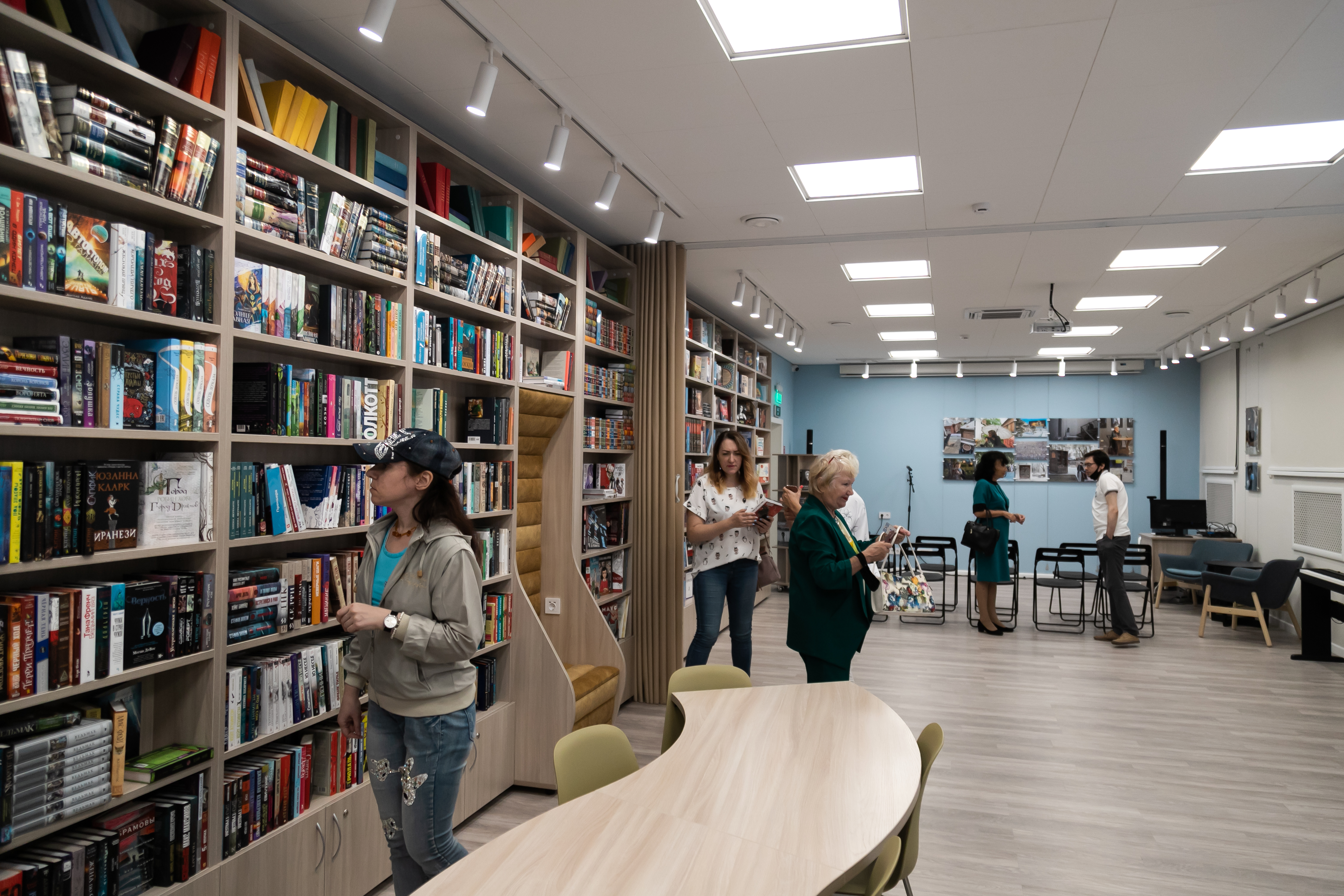 Внутри гостей ждало обновлённое библиотечное пространство – здесь заменили буквально всё (полы, облицовку стен), установили современные системы освещения, спасением в душный день стали работающие кондиционеры. Слева от входа в библиотеку разместилась кофейня, а повернув направо, можно наконец попасть в царство книг. К открытию для библиотеки закупили более 3000 экземпляров.