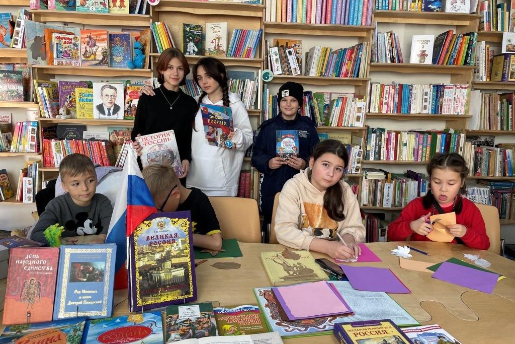 В библиотеке № 7 юные читатели познакомились со слайдовой презентацией «Живи и славься, Русь святая!», отвечали на вопросы викторины. Ответы разыскивали в книгах, представленных на книжной выставке. Они познакомились с книгами Николая Головина «Моя первая русская история», услышали рассказ из книги «Минин и Пожарский» о Смутном времени на Руси, когда на ослабевшую от раздоров страну пытались захватить враги. Дети занялись творчеством и терпеливо мастерили бумажное панно – символ России в виде цветочной композиции.
