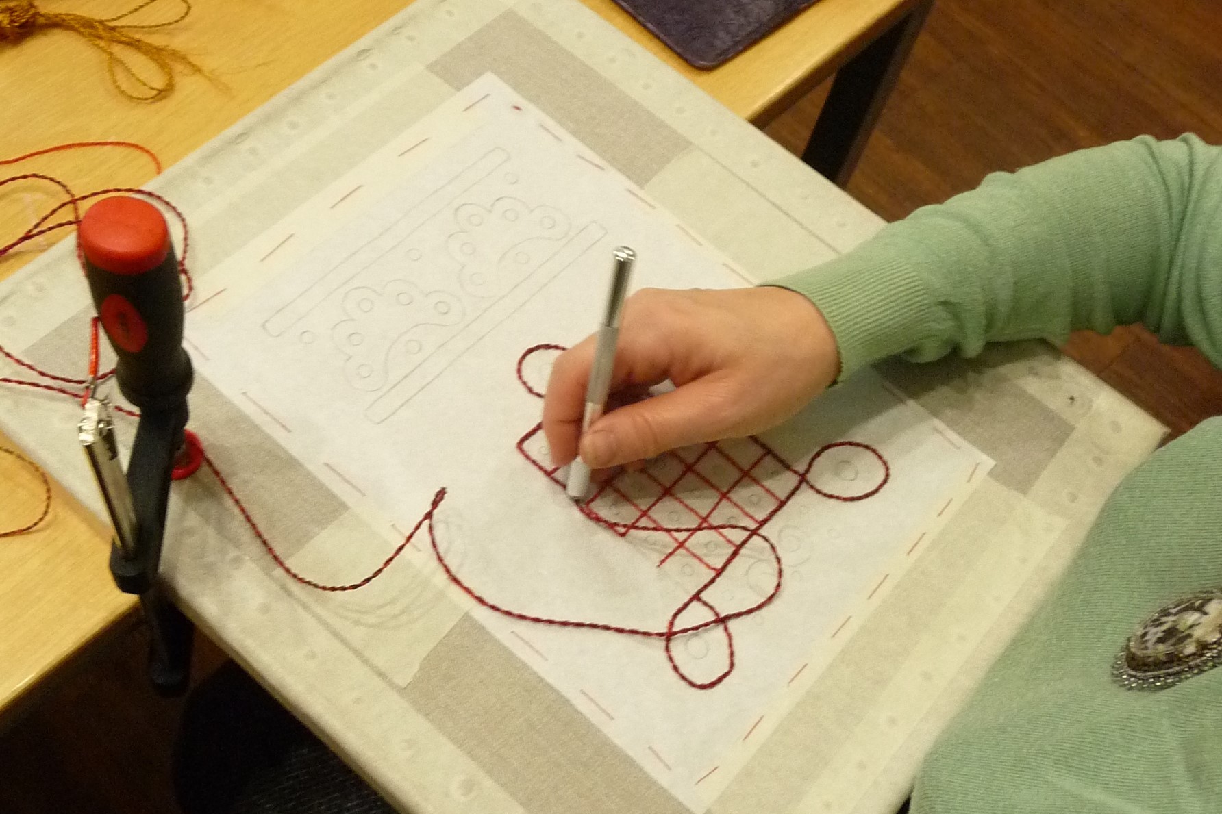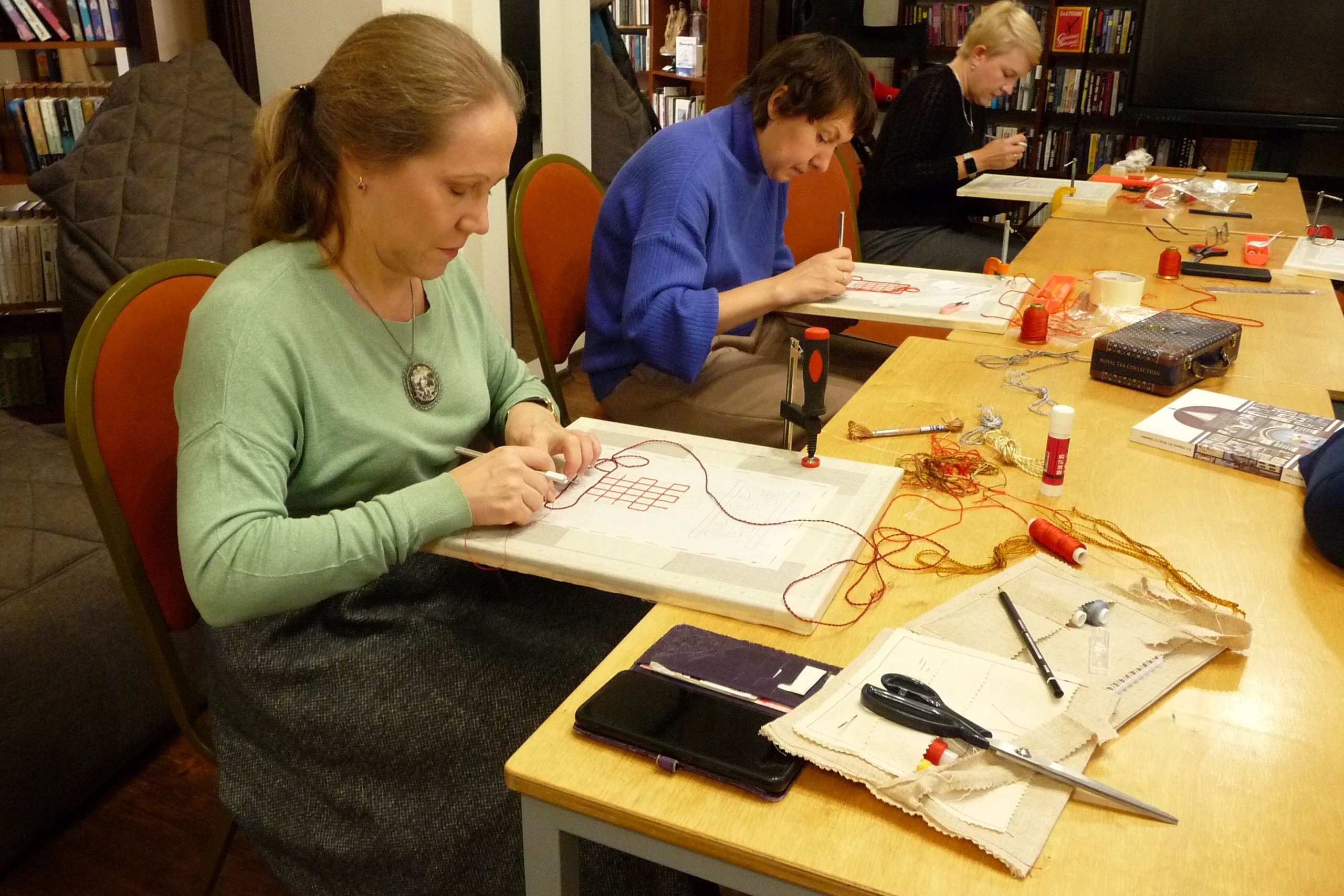 На занятии по скручиванию шнуров и вышивке мастера Марина Иов и Жанна Славинская познакомили учениц с основными технологическими приёмами и инструментами для выполнения работы.