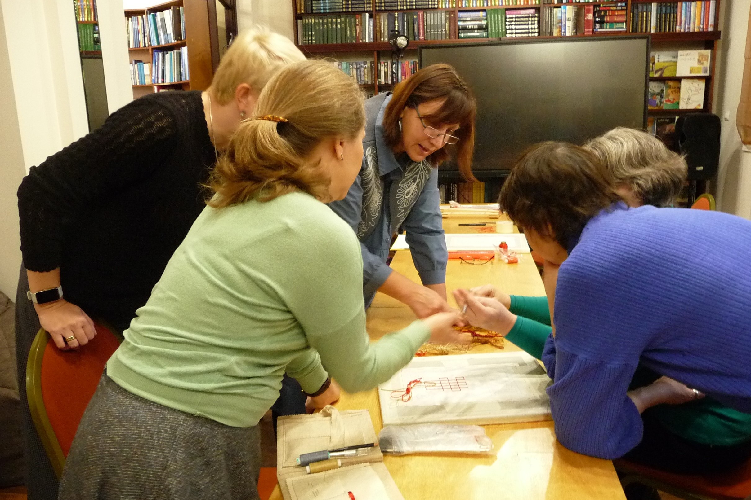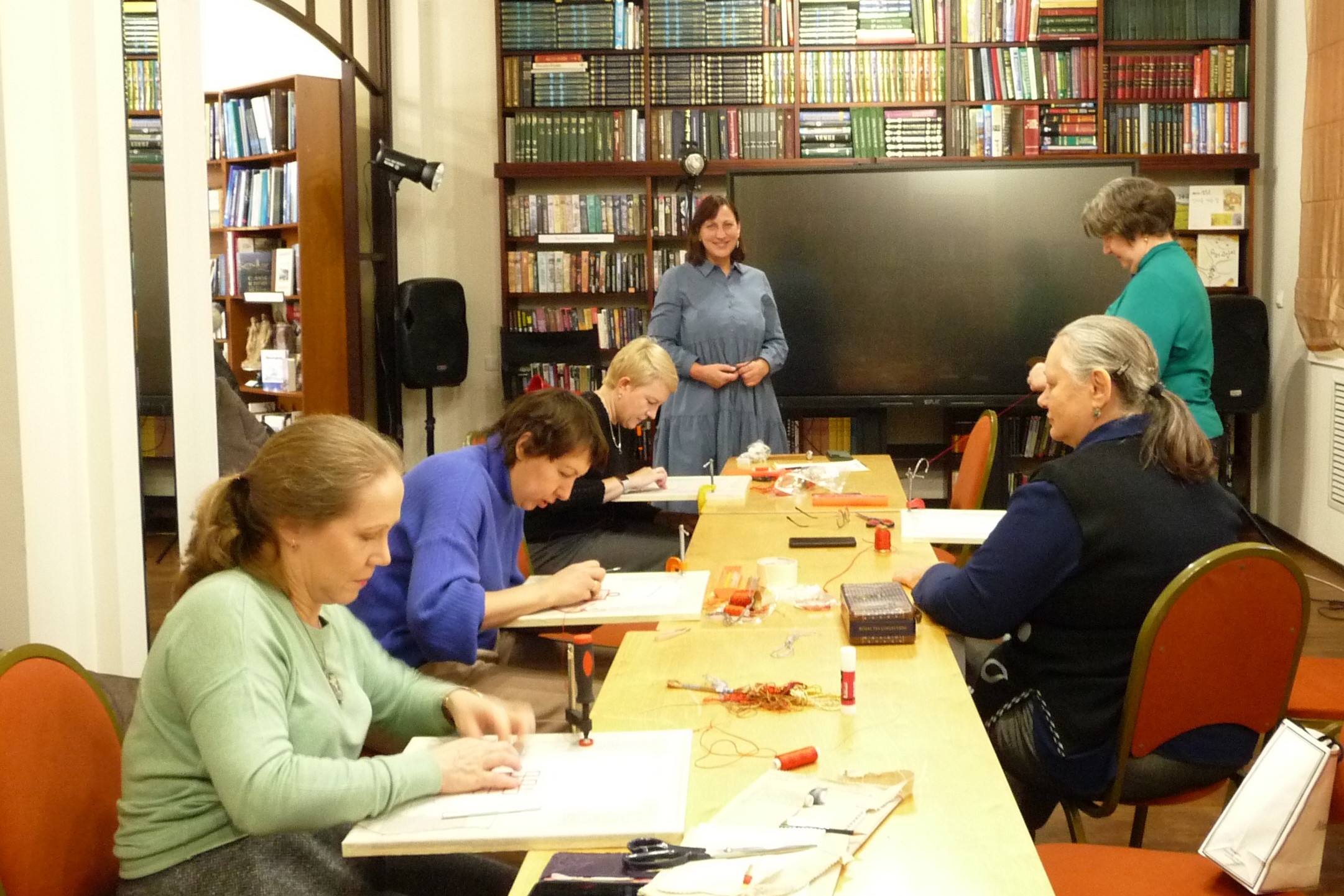 В модернизированной библиотеке № 10 (ул. Верхнепортовая, 76) состоялось 2 декабря заключительное занятие по курсу прототипирования изделий в техниках золотного шитья. Организатор курсов — мастерская светского и церковного золотного шитья «Золотая нить».
